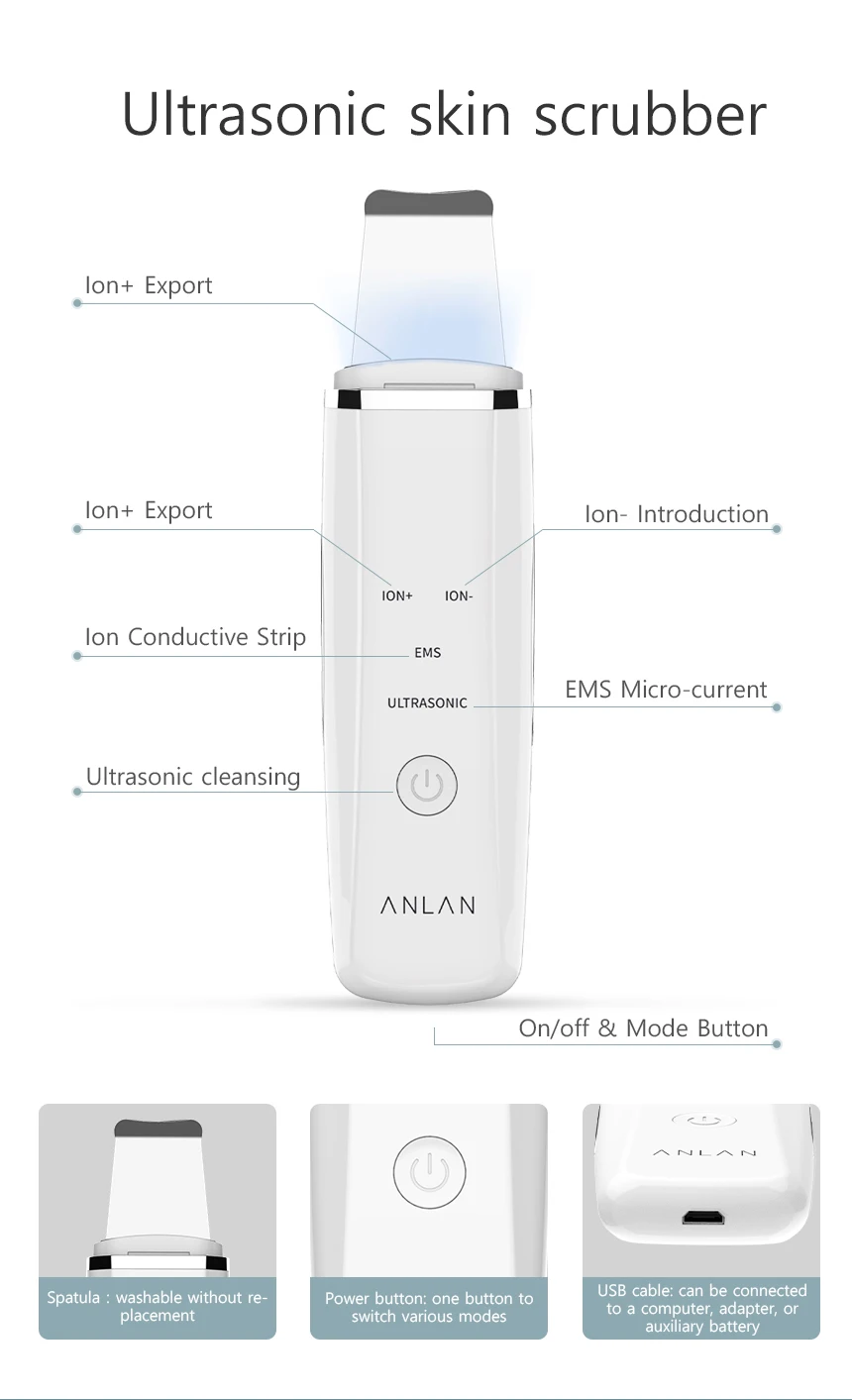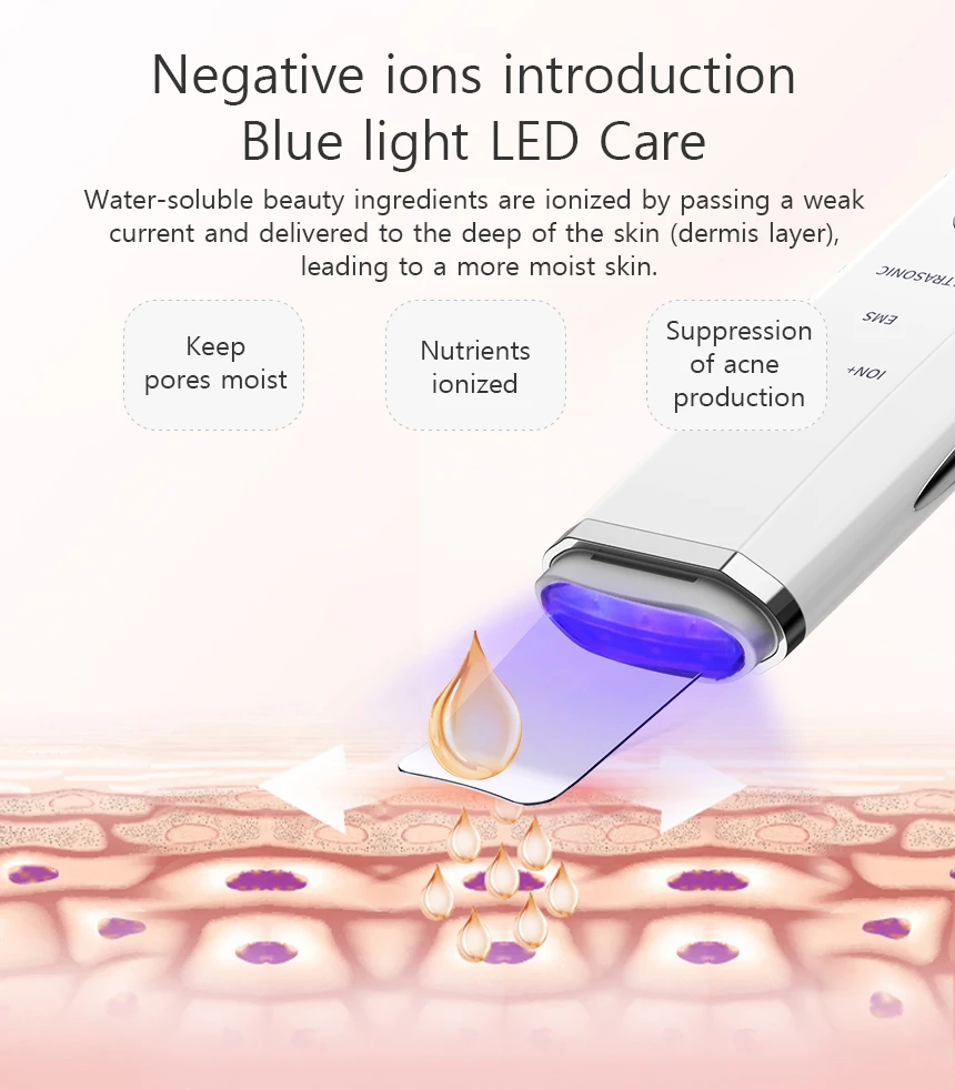 Через средство на коже (вода, макияж romover и т. д.) распыляется в нано-пузырь ультразвуковой технологией высокочастотной вибрации. Настоятельно рекомендуется использовать это после душа или после отпаривания лица, чтобы открыть поры. Легко сделать вашу кожу более чистой и гладкой.