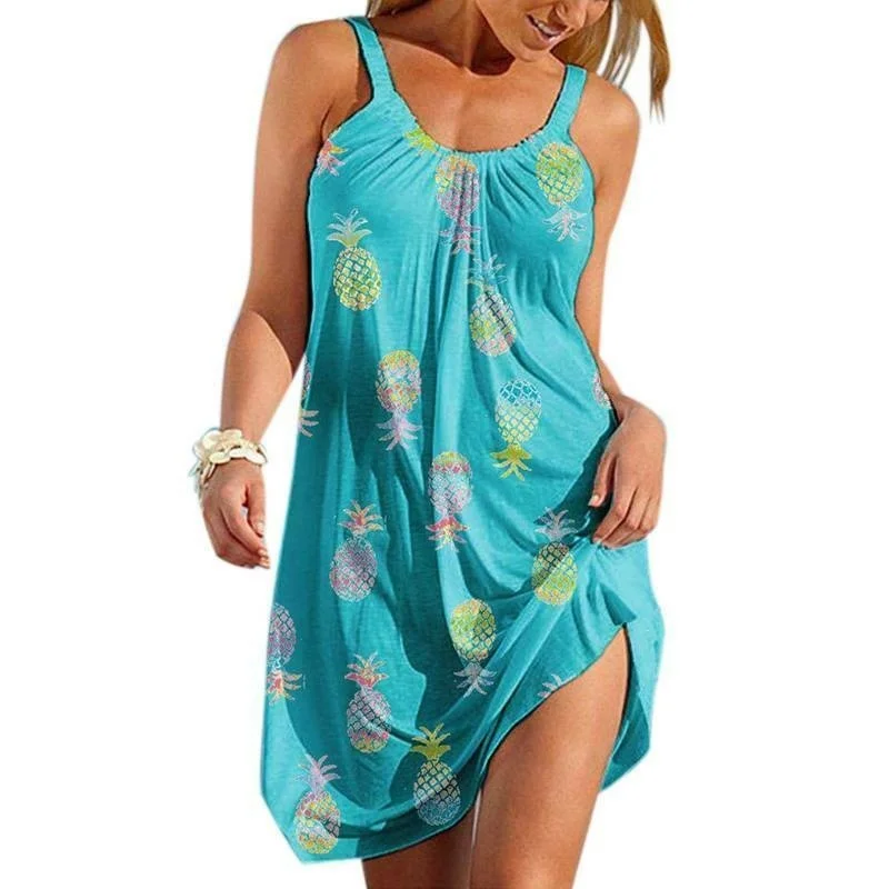 Женское летнее платье с принтом и круглым вырезом без рукавов, мини-платья для женщин, повседневное пляжное свободное платье-спагетти размера плюс