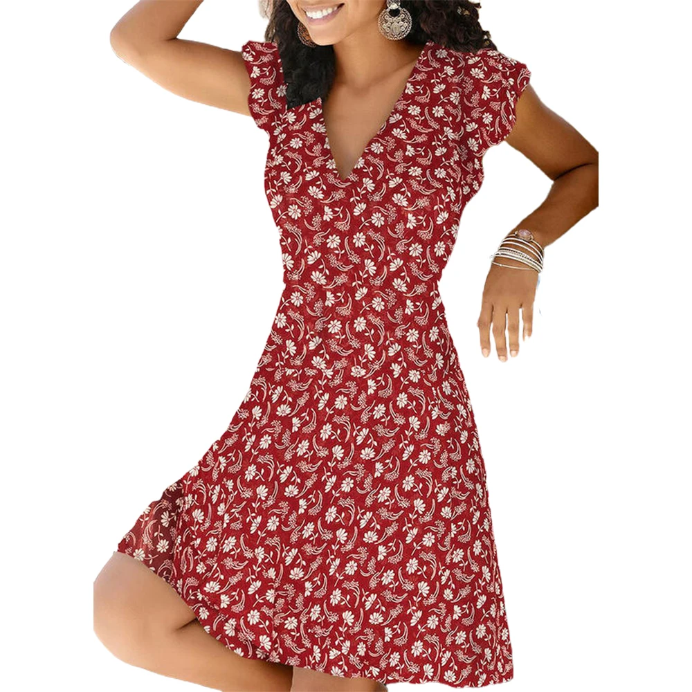 Женское платье с цветочным принтом, v-образным вырезом, коротким рукавом, мини-платье А-силуэта, летнее платье, пляжный праздничный сарафан для женщин, одежда