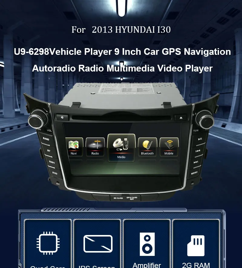 Применение: для Hyundai i30 2013 Ключевые особенности: 1. ЖК-дисплей высокой четкости 16:9 (разрешение 1024x600 или 800*480), стандартный емкостный сенсорный экран. 2. Автомобильный радиотюнер, FM/AM RDS, 54 Предустановленная станция. 3. DVD/VCD/CD/MP3/WMA/MP4/DIVX/JPEG мультимедийный плеер 4. Встроенный Bluetooth V4.0 с A2DP, Hands-free, передача телефонной книги с алфавитным именем поиска, запись звонящего, История звонков. 5. Поддержка 1080P видеоплеера, MPEG2,MPEG4,H.264,VC-1,RM,RMVB,AVS,VP6,VP8,MKV,AVI,MP4,MOV,WMV и т. д. 6. GPS Быстрое позиционирование и навигация, поддержка карты google и waze и т. Д. 7. Поддержка 720P HD DVR, запись и сохранение данных изображения на sd-карте. 8, 4*45 Вт усилитель мощности 9. Поддержка фронтальной камеры, 1 ТБ HD и OBD. 10. Поддержка Waze, google on-line maps и т. Д. 11. Внутренний Wi-Fi Встроенный с внешней wifi антенной и 3G готов 12. Двустороннее управление зеркальной связью. 13. DAB + Радио вариант