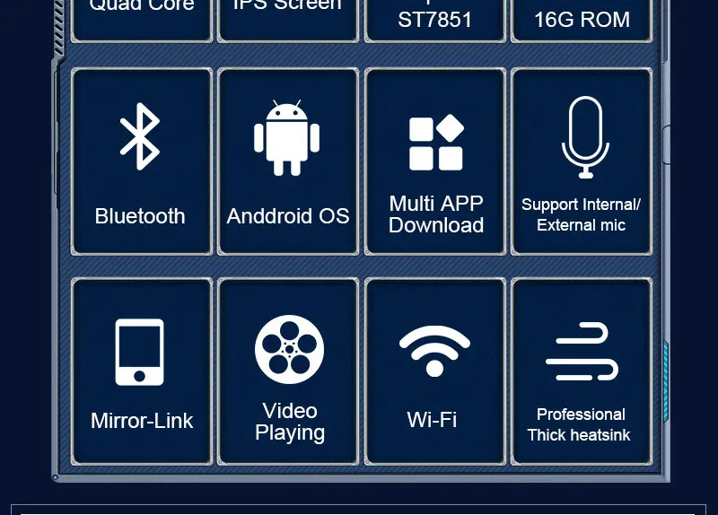 * Процессор: ARM Cortex A9 quad core 1,6 GHz * ОЗУ: 1 Гб памяти Sumsung DDR3 * ПЗУ: 16 Гб Toshiba Flash * MCU: ST 8S207 * Графический процессор: Mali-400 3D графический двигатель * Радио тюнер: NXP TEF 6686 * Аудио IC: ST7719 * Усилитель IC: ST7388 * BT модуль: CSR BC6 с анти-эхо ic * Hanstar A + противотуманные высокой четкости LCD 1024*600 * Высококачественный стеклянный емкостный сенсорный экран * DVD лазер: Hitachi 1200XH * Емкость: Lelon * GPS Чипсет: U-Blox