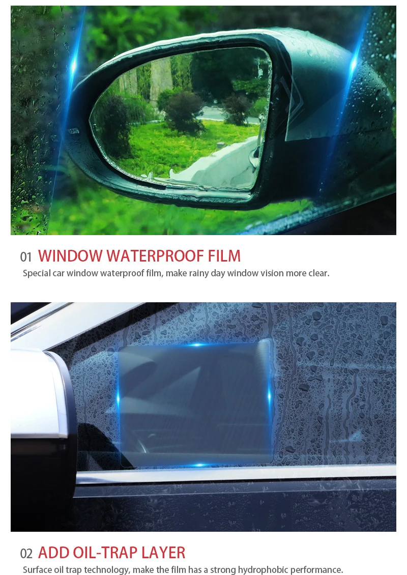 2. Технология нанесения нанопокрытия: автомобильная пленка на зеркало заднего вида использует технологию нанесения нанопокрытия, чтобы эффективно уточнить площадь обзора, чтобы избежать возможные опасности, добавить слой масляной ловушки, сделать пленку высокой гидрофобной производительностью;