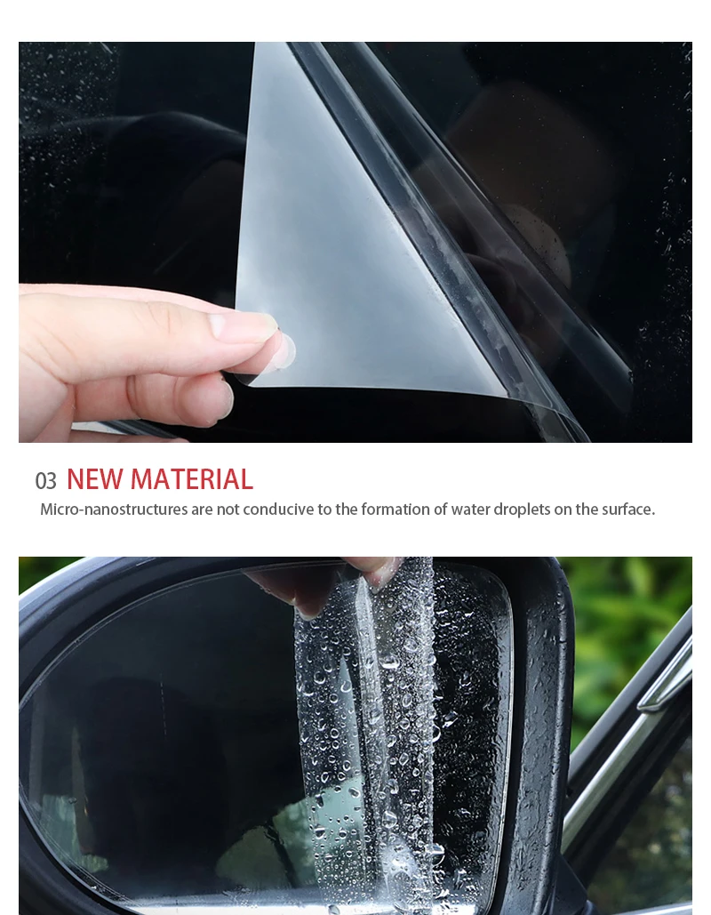 2. Технология нано-покрытия: автомобильная пленка на зеркало заднего вида использует технологию нано-покрытия, чтобы эффективно уточнить Область обзора, чтобы избежать возможных опасностей, добавить слой масляной ловушки, сделать пленку сильной гидрофобной производительностью;