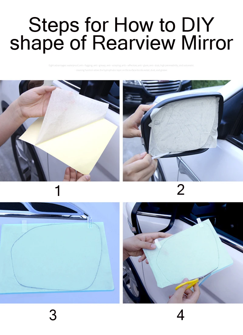 5. Многофункциональная защитная пленка: Автомобильная зеркальная пленка заднего вида-это противотуманные, антибликовые, противотуманные, водонепроницаемые, непромокаемые, антибликовые и масляные пятна, дает вам беспрецедентное чувство безопасности и четкое видение;