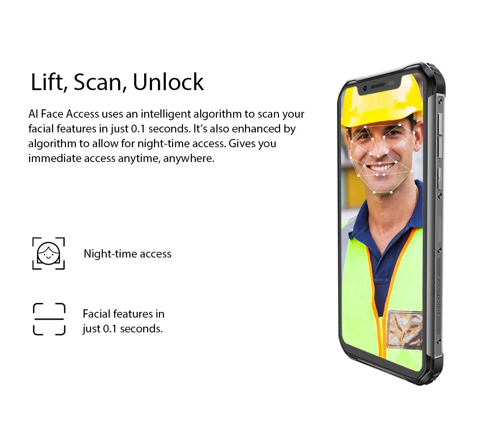 -ОС: Android 9,0 -Процессор: Helio P70 AI обработчик (MTK6771T) Octa core, 12 нм 4X Cortex-A73 2,1 ГГц 4X Cortex-A53 2,0 ГГц -SIM: две Nano sim-карты -Аккумулятор: 5580 мАч (быстрая зарядка 12 В 2 а) -Память: 4 Гб RAM 128 ГБ ROM Дисплей: 6,21 дюйма 2248*1080 пикселей, FHD + 19:9, стекло Corning Gorrila 3,10 точек касания -Фронтальная камера: 8.0MP, задняя-камера: 16.0MP + 0.3MP -Функция: IP68, IP69, MIL-STD-810G, EX, отпечаток пальца, NFC, Беспроводная зарядка (беспроводное зарядное устройство не входит в комплект), FM, OTG, FACE ID