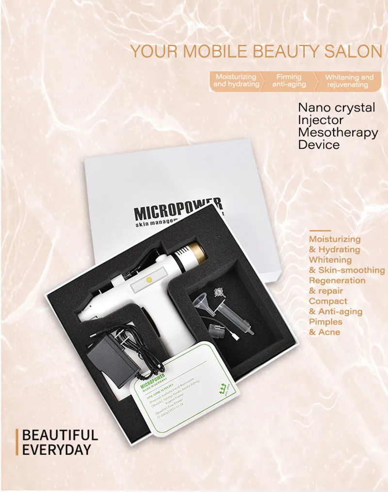 Принцип работы Нано кристаллит изготовлен из чистого одинарного кристаллического кремния высокой чистоты, резной с нанотехнологией. Каждая игла на одном чипе равна 1/1000 волоса. Нано кристаллит может открыть сотни микроканалов кожи одним касанием на коже. Он открывает кутикулу, не повреждая кожу, которая безболезненная и Неинвазивная. Стимулирует поглощение экстракта как можно скорее. Преимущество продукта 1. Этот жидкомеханический инжектор может быстро очистить кутикулу, способствовать поглощению активного ингредиента в 10 ~ 20 раз, не касаясь капилляров и нервов, поэтому он безболезненный, легкий и быстрый в эксплуатации. 2. Он может восстанавливать барьер кожи, увлажнять кожу, красоту кожи, светильник, осветлять цвет кожи и приносить вам здоровую и красивую кожу. 3. Кроме того, он стимулирует кровообращение через тепло и холод, таким образом, для укрепления эластичности кожи, Эффективно сокращает поры и облегчает пятна, уменьшает морщины и делает кожу более нежной и гладкой. Название продукта нано Кристалл инжектор Размеры: 23,6*15*5 см Вес: 250 г Мощность: 5V1A Материалы: АБС-пластик Стиль, вихревой расходомер Тип иглы: Форсунка Нано кристаллическая обработка инжектора: Используйте волшебную иглу головки микрокристалла, чтобы проникнуть в кутикулу кожи, открыв пор эпидермального слоя Кожи, инъекции активного ингредиента питания. Таким образом, он может восстанавливать стареющую кожу и Возрожденный коллаген, удалять морщины и Пятна, улучшают цвет лица и подтягивают лицо. Особенности инжектора Nano Crystal: 1. Изготовлен из кристаллического кремния высокой чистоты, он может быстро открыть канал кожи и кутикулу, не повреждая кожу. 2. Тонкая инъекция, быстрая и удобная 3. Безболезненный и неинвазивный, способствует всасыванию экстракта как можно скорее. 4. Эффективно улучшает большие поры, разглаживает морщины и гусиные лапки, делает вашу кожу упругой и упругой. 5. Помогает коже детоксифицировать и осветлить пятна, осветлить тон кожи и быстро снять аллергическую кожу. 6. Увлажнение и увлажнение, можно использовать в качестве ежедневного ухода за кожей для содействия поглощению питательных веществ. 7. С функциями нагрева и охлаждения, нагревание может диастолической пор, способствует циркуляции крови, скорость поглощения Питание, ускоряет обмен веществ, устраняет токсины, устраняет мешки для глаз и темные круги, удаление морщин; Охлаждение может уменьшаться Пор, блокировка в воде кожи, улучшение коллагенового волокна, подтягивание упругости кожи, разглаживание морщин и гусиных ног, снижение метаболизма Устраняет отеки кожи, боль. Используется исключительно для лечения чувствительной кожи. 8. Подходит как для профессионального салона красоты, так и для личного использования. Холодильное оборудование/Отопление Функция Нагревательные эффекты 1. Нагревание может расслабить мышцы, сбалансировать вегетативные нервы и облегчить боль и боль, чтобы пользователи чувствовали себя тепло и комфортно; 2. Нагревание стимулирует кровообращение, повышает содержание кислорода в крови, открывает пор, расширяет кровообращение, таким образом, чтобы способствовать быстрому поглощению ингредиента питания на коже. Это самый мягкий, удобный эффективный метод введения. 3. Увеличивает скорость метаболизма кожи, увеличивает содержание тепла в ткани и, ест