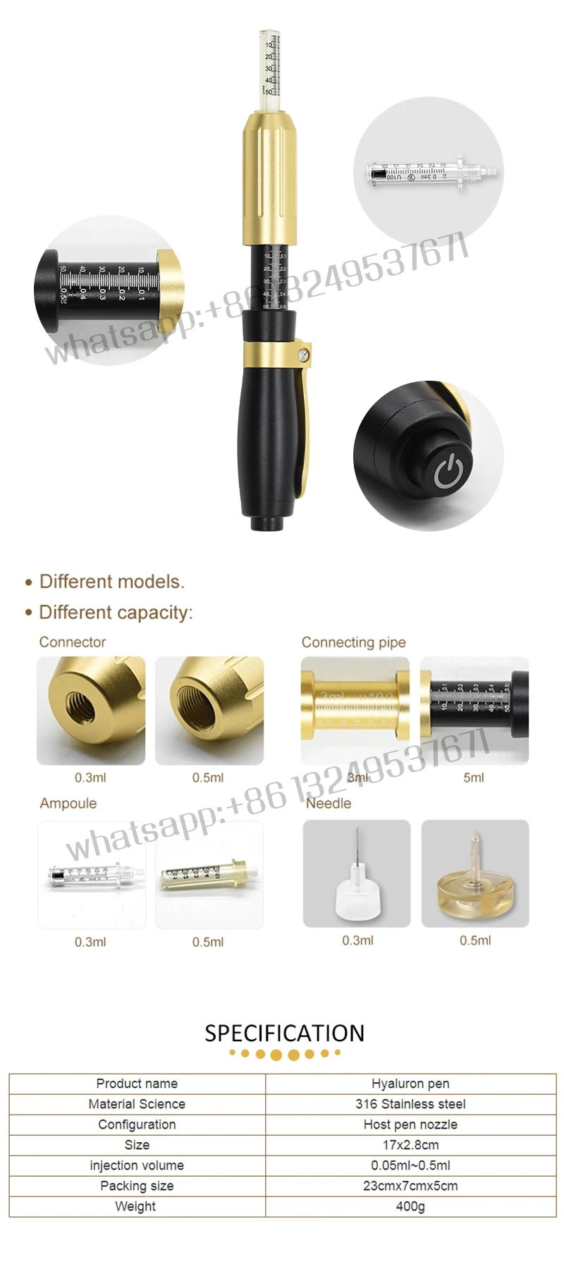 2 в 1 неинвазивный небулайзер мезо инъекционный пистолет гиалуроновая ручка 0,3 мл и 0,5 мл две головки золотая ручка с гиалуроновой кислотой для наполнения губ инъекции Описание продукта: Тип 1: гиалуроновая ручка 2 в 1 Тип 2: двухголовная гиалуроновая ручка Особенности: заполнение губ, удаление сосудов, омоложение кожи, темные круги, удаление морщин, потеря веса, увлажняющий крем, отбеливание, увлажняющий крем Материал: 316 нержавеющая сталь (Профессиональная Медицинская нержавеющая сталь) Объем впрыска: 0,3-0,5 мл Режим работы: распыление высокого давления Глубина впрыска: 6-15 мм Принцип работы: Пружина и поршень, которые позволяют под давлением быстро и равномерно вводить препараты под кожу через отверстие диаметром 0,1 мм, что в два раза меньше толщины иглы для инъекций! С помощью энергии механического действия пружина и специальный поршень в аппарате позволяют под давлением быстро, но аккуратно проталкивать поток лекарств через Микроскопическое отверстие в подкожной ткани. Препараты усваиваются гораздо лучше и быстрее, чем с введением иглы, что было подтверждено в серии исследований и тестов, проводящихся в разных странах мира. Идеальное решение для тех, кто подвержен рубцам и подкожным сгусткам. Преимущества ручки Hyaluron: * Не вызывает болезненных ощущений впрыска топлива * Инъекция без иглы устраняет риск инфекции от иглы * Не оставляет рубцов и следов от проколов на ткани кожи с помощью иглы * Лучшее и быстрое поглощение лекарств * Строго Подкожная инъекция-устраняет риск проникновения препарата в мышцу * Быстро, легко и безопасно * Раздельное и экономичное дозирование препарата