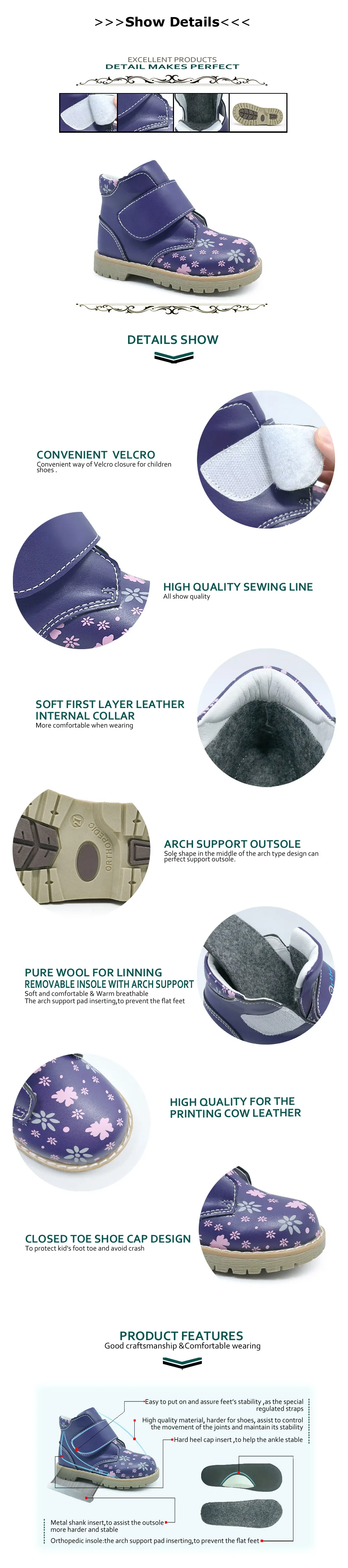 > 1. Каковы ортопедические туфли? Ортопедическая обувь-это медицинская обувь, призванная предотвратить и исправить патологию ног, может защитить стопу сустава и исправить деформацию ног, чтобы помочь здоровому росту суставов детской ноги. > 2. Каковы особенности ортопедической обуви? 1) прочные и прочные удлиненные задние колпачки стабилизируют стопу в правильном положении. 2) мягкие внутренние воротники обеспечивают гладкий контакт кожи с краями обуви во время движения. 3) Арка поддержки стельки и Томас пятки подошвы, чтобы дать поддержку стопы. 4) застежка на липучке плотно фиксирует ноги внутри обуви > 3. Каковы функции ортопедической обуви? Для профилактики и лечения ортопедических аномалий. Для предотвращения и исправления детской плоскостопия, лапки, стопа с вальгусной деформацией, супинатором, пронатором, клубной стопой, ногой X/O и т. д. > 4.подходит ли для ортопедической обуви нормальная стопа? Да, нормальные здоровые ноги также подходят для ношения ортопедической обуви. Ортопедическая обувь очень важна для первых шагов ребенка, фиксирует стопу, увеличивает площадь опоры стопы и перераспределяет нагрузку на тело, избегая деформации стопы, чтобы помочь нормальному здоровому росту ног. Поэтому родитель должен начать выбирать ортопедическую обувь для ваших детей, когда ребенок учится ходить.