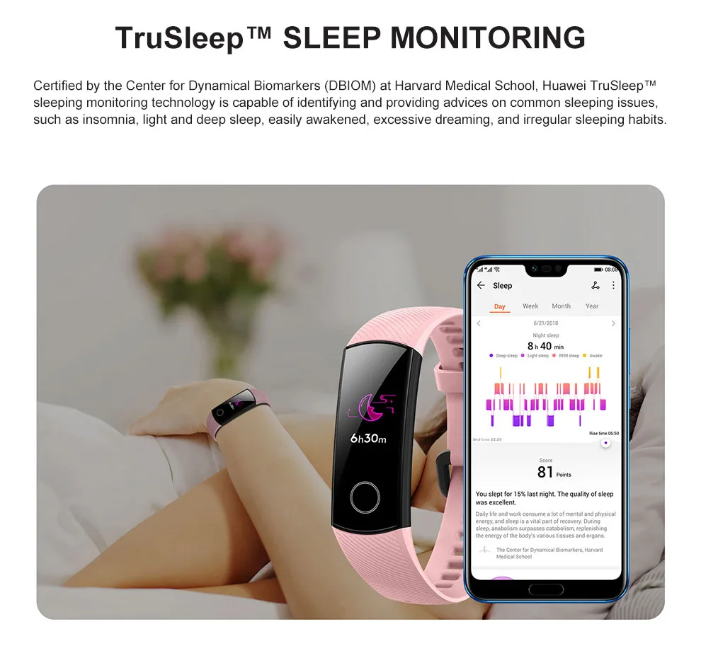 Сертифицированный центром динамических биомаркеров (DBIOM) в Гарвардской медицинской школе, Технология мониторинга сна Huawei trasleep способна идентифицировать и предоставлять рекомендации по общим вопросам сна, таким как бессонница, легкий и глубокий сон, легко пробуждаемый, чрезмерный сон и неправильные привычки сна.
