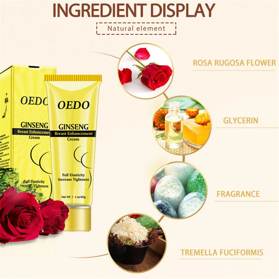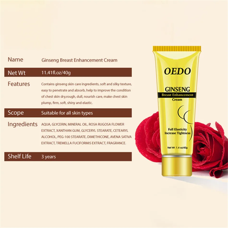OEDO Ginseng Breast Enhancement Cream Effective Full Elasticity Breast Enhancer Increase Tightness Big Bust Body Cream Breast Care Brand: OEDO Name: Ginseng Breast Enhancement Cream Slogan: Full Elasticity Increase Tightness Net Wt: 11.41fl.oz/40g Product Features: Contains ginseng skin care ingredients, soft and silky texture, easy to penetrate and absorb, help to improve the condition of chest skin dry,rough, dull, nourish care, make chest skin plump, firm, soft, shiny and elastic. Ingredients: AQUA, GLYCERIN, MINERAL OIL, ROSA RUGOSA FLOWER EXTRACT, XANTHAN GUM, GLYCERYL STEARATE, CETEARYL ALCOHOL, PEG-100 STEARATE, DIMETHICONE, AVENA SATIVA EXTRACT, TREMELLA FUCIFORMIS EXTRACT, FRAGRANCE. Scope of Use:Suitable for people whose chest needs improvement. Usage Method: Take appropriate amount of this product after bathing with hot water every evening, evenly smear on both sides of the breast, massage the breast from the outside to the inside circle for a while. Note:If you have any skin discomfort,please stop using it. Storage Condition: Please place in a cool place and avoid direct sunlight. Shelf Life: 3 years Package Included: 1x Ginseng Breast Enhancement Cream Notes: Due to the difference between different monitors, the pictures may not reflect the actual color of the item. Compare the detail sizes with yours, please allow 1-3cm error, due to manual measurement. Please leaving a message before you give the bad feedback, if the products have some problems. Thanks for your understandings