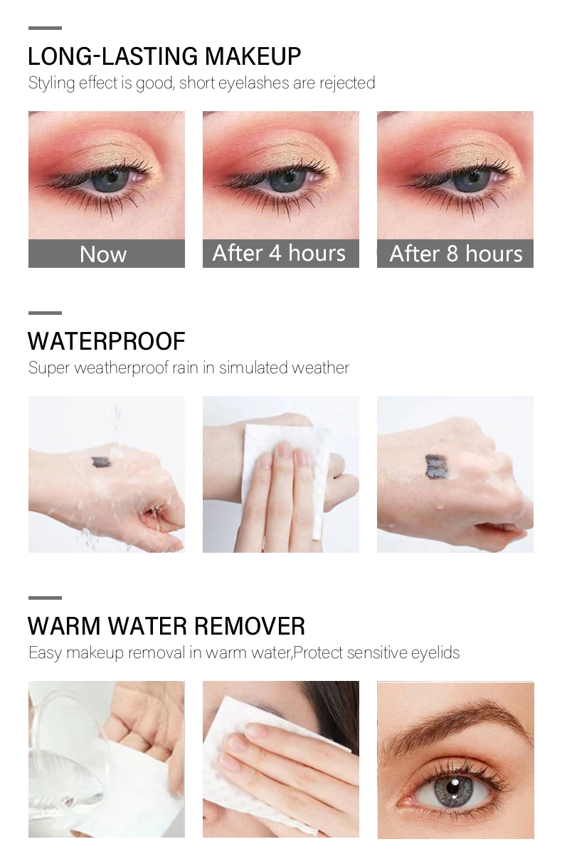 1. Стойкий макияж Хороший формирующий эффект, отклоняет короткие ресницы. 2. Водонепроницаемость и защита от пота Имитирует погоду дождя, супер водонепроницаемый. 3. Теплая вода может быть разгружена Легко снимайте макияж, больше не натирайте веки!