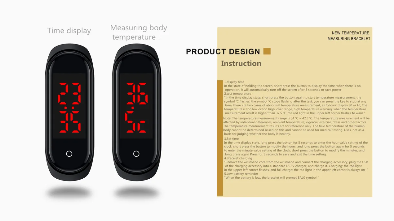 Характеристики: Отображение времени: короткое нажатие кнопки для отображения времени. Он будет закрыт в течение 5 секунд, когда не будет работать, автоматически выключается, чтобы сэкономить электричество. Проверка температуры: При отображении времени нажмите кнопку, чтобы измерить символ температуры, ℃. Он перестанет мигать, когда тест завершится. Есть два случая аномального измерения температуры (LO или HI отображается), что указывает на слишком низкую или слишком высокую температуру, вне диапазона. Установите время: под отображением времени удерживайте кнопку в течение 5 секунд, чтобы войти в настройки числового значения часов, и нажмите короткое нажатие, чтобы изменить количество часов. После того, как металлический лист на спине контактирует с кожей человека, он может обнаруживать температуру человеческого тела в любое время и в любом месте. Силиконовый ремешок мягкий и удобный, легко регулировать длину. Простой и стильный дизайн, подходит для многих случаев. Будьте в курсе температурного состояния и оставайтесь здоровыми. Название товара: умный Браслет Материал ремешка: силикон Материал браслета: поликарбонат Размер экрана: 1 дюйм Емкость аккумулятора: 50 мАч (в комплекте) Режим работы: сенсорный Интерфейс: USB 2,0 Функция связи: не поддерживается Особенности: Удобный, измерение температуры, точный Примечания: благодаря светильник и экрана Цвет Товара может быть s светильник ly отличается из-за характеристик монитора компьютера. Посылка включает в себя: 1 умный Браслет 1 х USB кабель для зарядки