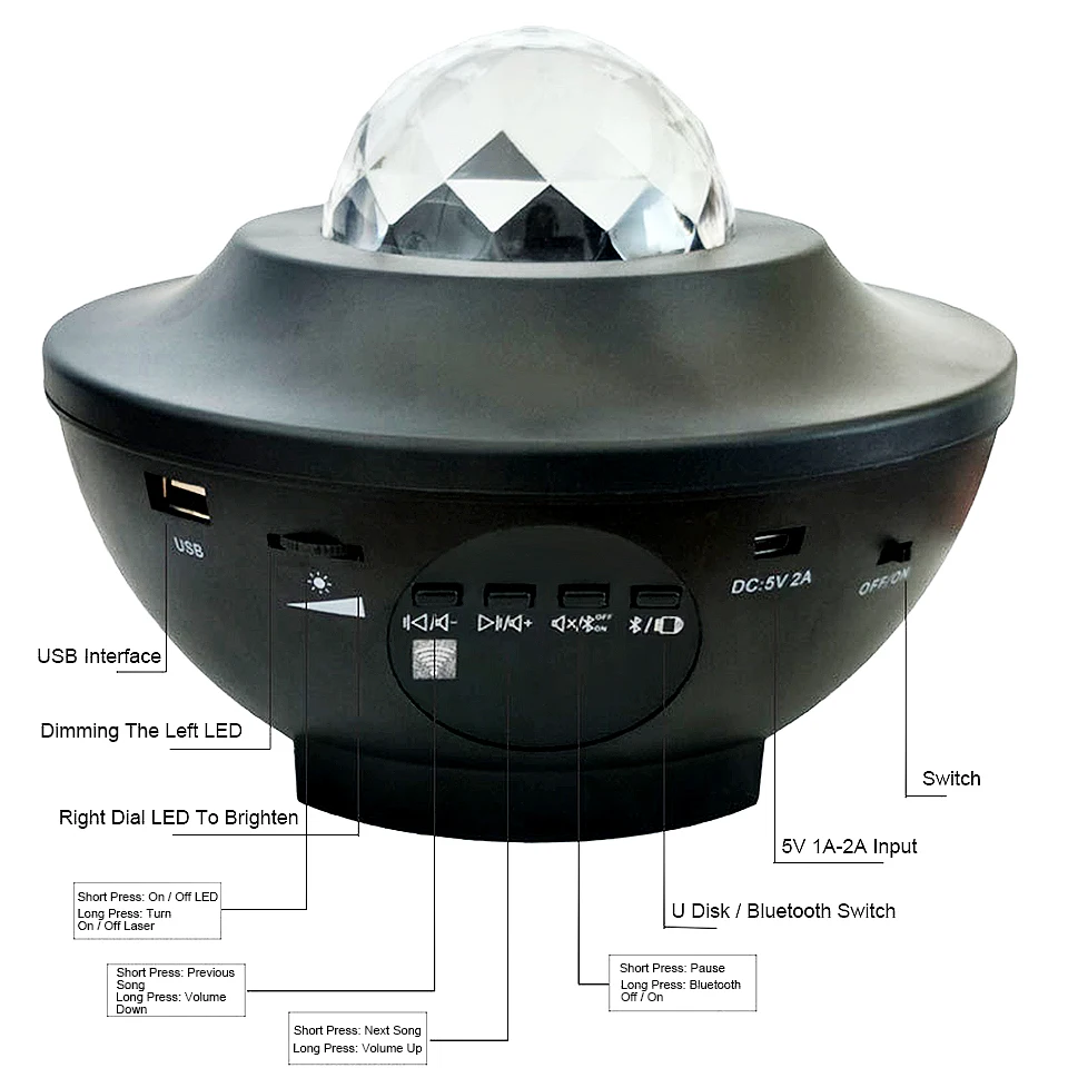 Описание: Этот продукт относится к комбинации четырехцветной лампы водяного знака и зеленого лазера. Водяной знак имеет четыре цвета: красный, белый, синий и зеленый. Цвет лазера зеленый. Пульт дистанционного управления может регулировать цвет водяных знаков, скорость водяных знаков, режим водяных знаков, режим bluetooth, одиночное управление водяными знаками, лазерное одиночное управление, яркость, управление музыкой, управление звуком, режим выбора, функция синхронизации, переключатель, любой мобильный телефон или другое устройство для включения bluetooth. Все можно подключить без проверки. Новая версия инструкции дистанционного управления: Установите 2 батарейки AAA для использования (ключи более чувствительны и просты в использовании). Корпус лампы может быть подключен к u-диску или кард-ридеру для воспроизведения музыки, может регулировать яркость, может регулировать громкость музыки, вверх и вниз музыку, пауза, выключение/включение Bluetooth, переключатель, питание через USB Android.