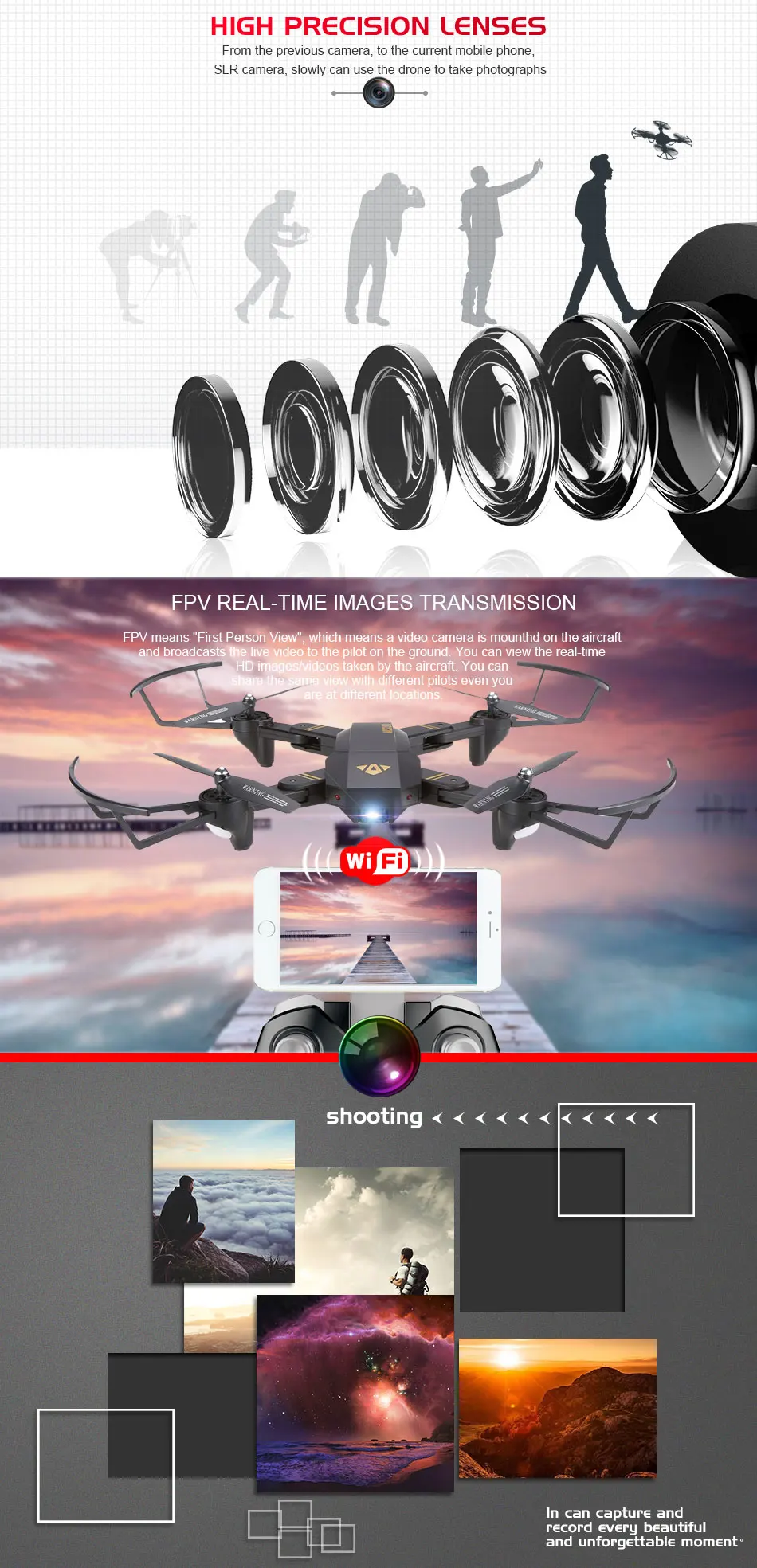 Особенности: Система передачи Wi-Fi обеспечивает легкий и веселый полет FPV. 0.3MP или 2MP камера может делать фотографии и записывать видео. Складной дизайн, портативный и легко носить с собой. Наклонная камера для регулировки угла обзора. Уникальный дизайн фюзеляжа и высокое качество живописи, выдающийся внешний вид. Модернизированный 2,4G 4CH передатчик для вашего легкого управления. Новейшая 6-осевая система управления полетом, обеспечивает супер стабильный полет. С безголовым режимом и одним нажатием кнопки возврата, вы можете свободно летать. Режим высокой/низкой скорости и функция 3D flip обеспечивают вам крутой опыт полета. Характеристики: Название бренда: VISUO Название модели: XS809HW Основной Материал: АБС-пластик Тип двигателя: Бессердечный мотор Пиксель камеры: 0.3MP/2MP Функция: вперед/назад, вверх/вниз, влево/вправо, боковой полет, парение, 3D сальто, скорость Н/л, Безголовый режим, Wifi FPV, фотосъемка, запись видео Режим контроллера: режим 2 Удаленное расстояние: около 100 м Время зарядки: около 50 минут Время полета: около 10 минут Аккумулятор для квадрокоптера: 3,7 в 900 мАч литий-полимерный аккумулятор Размер батареи: 74*31*11 мм Аккумулятор передатчика: 3 * AA (не входит в комплект) Размер изделия: В разложенном виде: 32,5*32,5*6 см/12,8*12,8 * 2.4in, В сложенном виде: 18*13*6 см/7*5,1 * 2.4in Вес изделия: 118,4 г