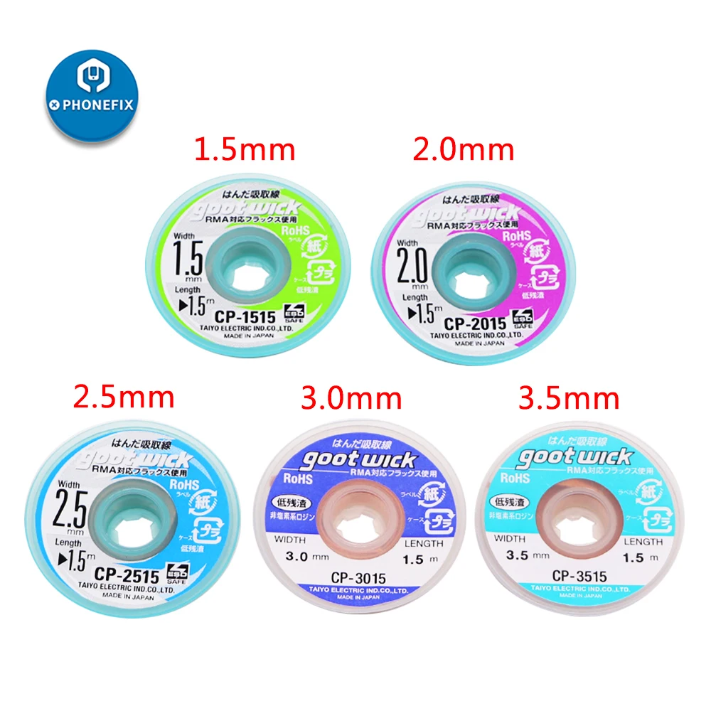 GOOT RoHS MSDS отвод фитиля Электрический удаление припоя для ремонта PCB RMA Точная работа с линией поглощения без хлораОписание:Всасывающий оловянный пояс и линия поглощения олова для поглощающего избыточного припоя олова, CP-3515/3015/2015/2515/1515 BGA Отбивающий Проволочный припой фитиль, за исключением поглощающего Олово избыточного припоя. VIPFIX линия поглощения сосания олова для поглощения олова избыточного припояСосательный оловянный пояс BGA оплетка припоя провода CP-3515 3015 2015 2515Оплетка для распайки: быстро удаляет нежелательный припой при использовании с паяльником.Опция линия поглощения олова:Вариант 1: CP-1515 -- 1,5 мм Ширина, 1,5 м длинаВариант 2: CP-2015 -- 2,0 мм Ширина, 1,5 м длинаВариант 3: CP-2515 -- 2,5 мм Ширина, 1,5 м длинаВариант 4: CP-3015 -- 3,0 мм Ширина, 1,5 м длинаВариант 5: CP-3515 -- 3,5 мм Ширина, 1,5 м длинаВариант 6: полный комплект CP-3515 + CP-3015 + CP-2015 + CP-2515 + CP-1515Плетеный копальный провод для демонтажа фитиляПредупреждение:Только прикасайтесь к захвату и упаковке отвода фитиля при распаковке. Отказ от этого приведет к серьезным ожогам.Чтобы избежать пожара, никогда не используйте паяльник и фитиль для распайки вокруг горючих веществ или во взрывоопасной среде.Внимание:Не прижимайте наконечник к фитилю для демонтажа, чтобы избежать повреждения и/или повреждения деталей и печатных плат.Не нагревайте промывочный фитиль более 5 секунд, чтобы избежать повреждения деталей и печатных плат.Использование:1. Поместите промывочный фитиль над припоем, чтобы быть удаленным, а затем нажмите на наконечник нагреваемого паяльника на фитиль для распайки. Припой будет поглощен.2. Извлеките Отбивающий фитиль после поглощения припоя.3. Отрежьте использованную часть фитиля с помощью кусачек.4. Повторите шаги 1,2 и 3, если припой не удален полностью. Рассасываемость может отличаться в зависимости от типа припоя. Sn63 % и 60% (содержание олова) обладают хорошей абсорбируемостью.
