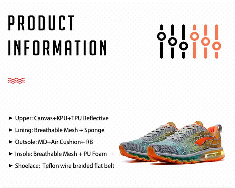 Верх: холст + КПУ + ТПУ светоотражающий Подкладка: дышащая сетка + губка Подошва: MD + Воздушная подушка + RB Стелька: дышащая сетка = пенополиуретан Шнурки: плоский ремень с тефлоновой проволокой