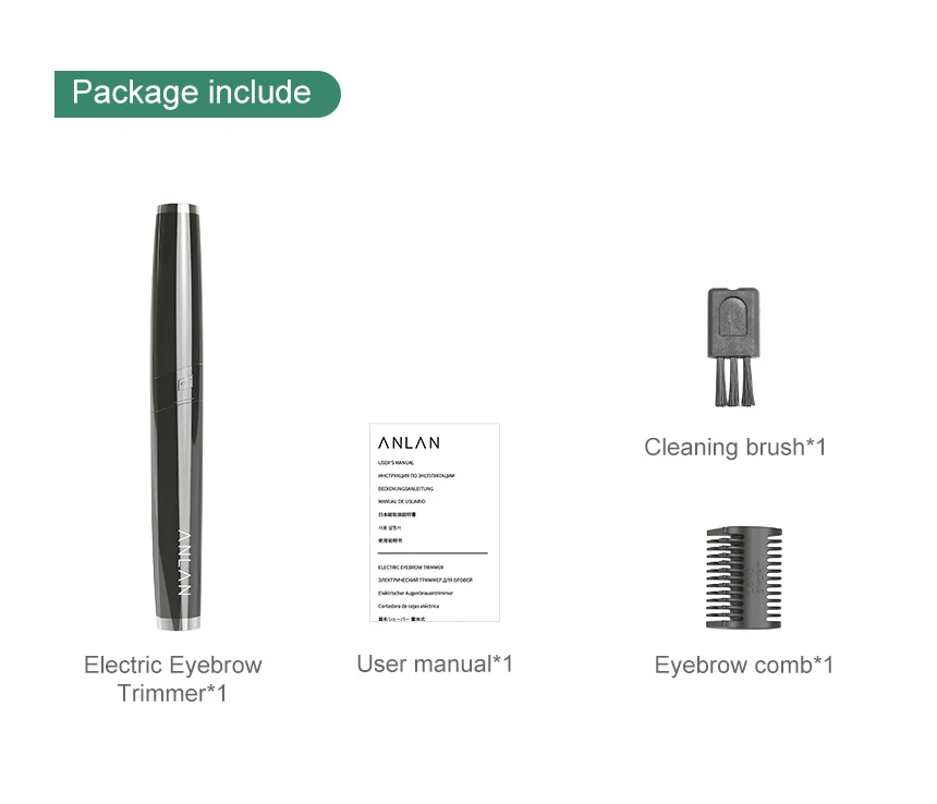 Электрический триммер для бровей * 1 Инструкция по эксплуатации * 1 Расческа для бровей * 1 Щетка для очистки * 1 Замененное лезвие * 1