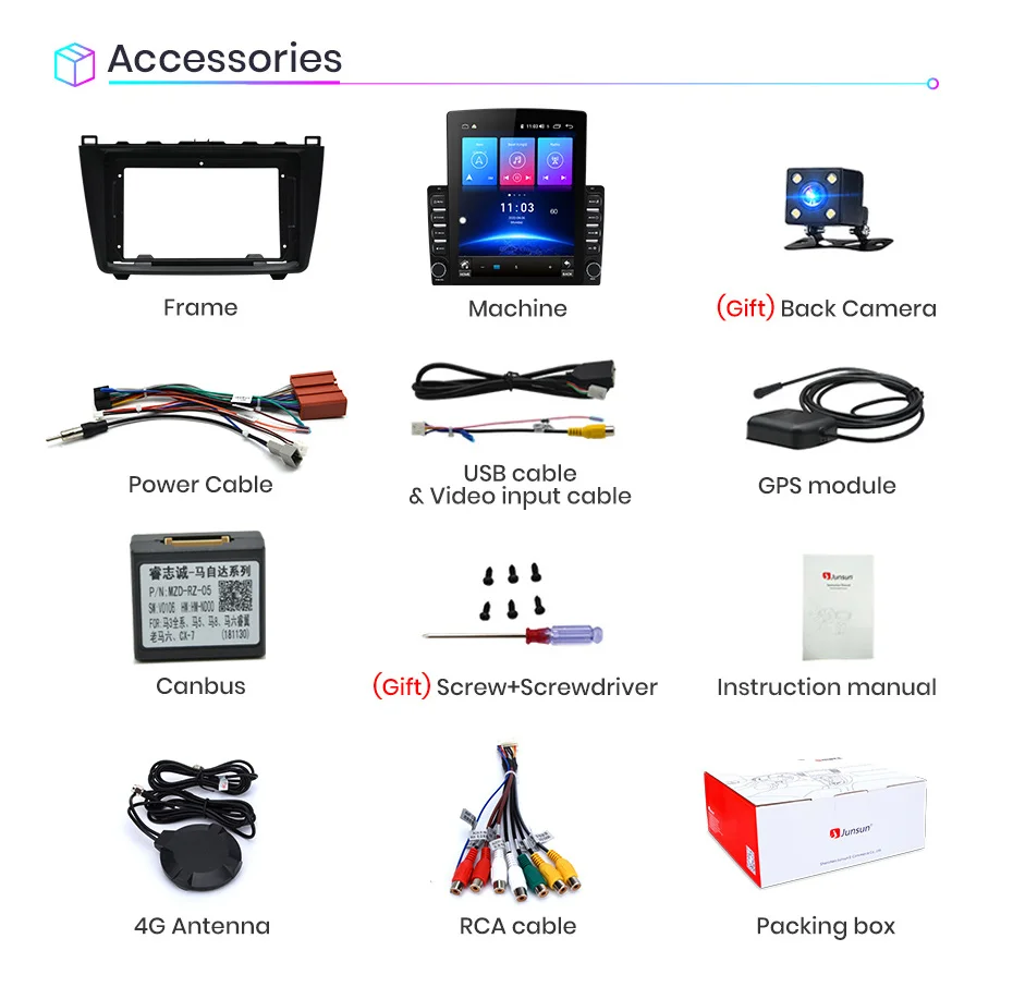 > Junsun V2 Pro для Mazda 6 2007-2012 Основные характеристики: > Для Tesla style-вертикальный экран, более удобный и роскошный > Android 8,1 Восьмиядерный процессор Intel 1,8 ГГц, высокое качество и более стабильный > 4 Гб (2 ГБ на выбор) флэш-память + 64 ГБ (32 Гб на выбор), более гладкая и быстрая; > Bulit-in CarPlay (опционально): легко управлять и обрабатывать Iphone через радио > DSP + TDA7851 : V2 Pro поддерживает 32-полосный эквалайзер, более точное управление звуком, обеспечивает праздник для ушей; > Другие функции: 9,7-дюймовый сенсорный экран 2.5D + встроенный Wifi и сеть 4G + gps-навигация (Обновление карты бесплатно, только поддержка бренда Junsun) + раздельный экран + управление рулевым колесом + зеркальная связь + Bluetooth + Встроенный микрофон + FM/AM + RDS (опционально) + Поддержка функции USB ADAS DVR (опционально) + Функция Европейского DAB (Опционально) + 1080P видео воспроизведение + HD 1024*600 + Система контроля давления в шинах (опционально) > OSD язык Русский, английский, испанский, итальянский, французский, немецкий, китайский, эстонский, польский, филиппинский, финский, корейский, голландский, хорватский, латышский, литовский, румынский, норвежский, португальский, японский, шведский, тайский, турецкий, украинский, венгерский. > 24H * 7 поддержка обслуживания В Junsun Наша цель-продолжать усердно работать, чтобы сделать инновационное оборудование и программное обеспечение автомобильного мультимедийного плеера радио, чтобы дать вам этот индивидуальный опыт. Мы предоставляем обновления для прошивки, программного обеспечения, gps-навигационных карт бесплатно.
