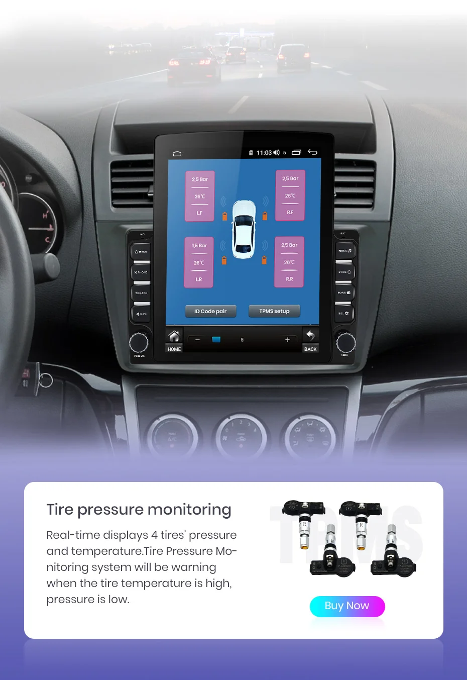 В режиме реального времени отображается давление и температура в 4 раза, как только давление в шинах или Температурный Предел превышен, сигнал тревоги будет немедленно срабатывать (нужно покупать отдельно)