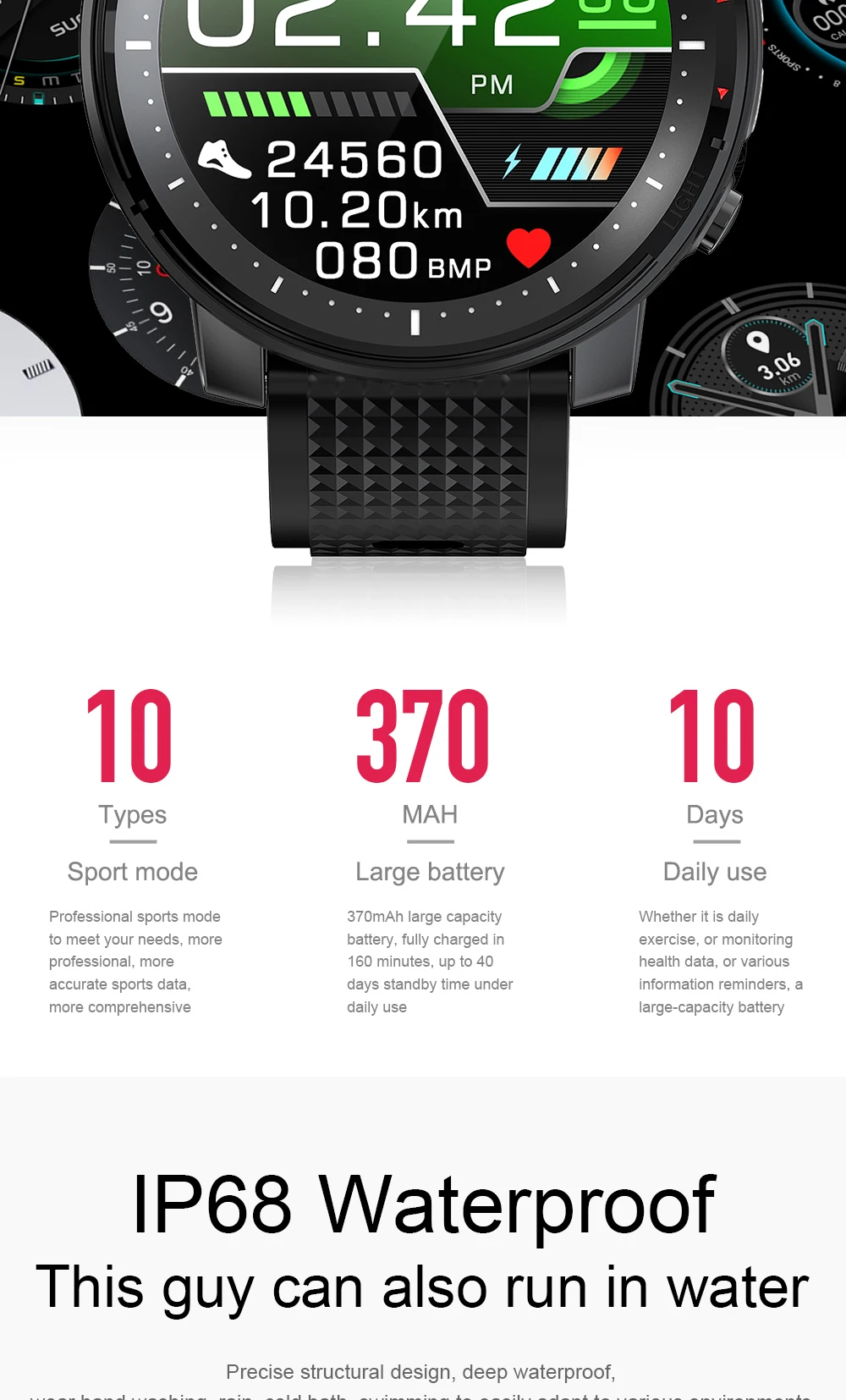 Hilighlight: IP68 водонепроницаемый, 1,3 дюйма IPS 360*360 пикселей Полный Круглый дисплей, 370 мАч аккумулятор, 7 дней работы от аккумулятора, фонарик.
