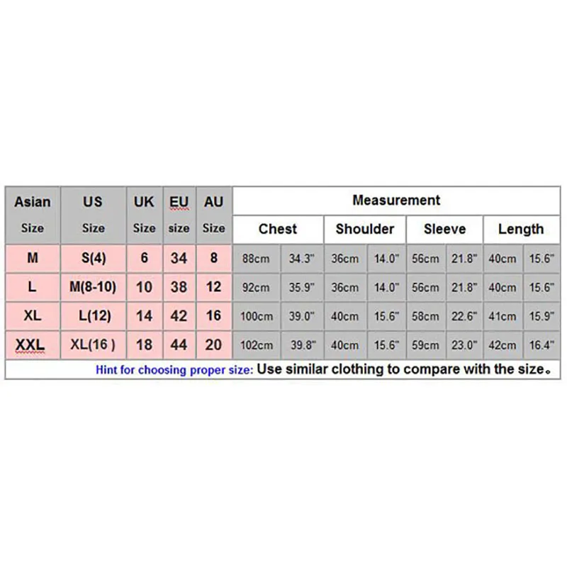 Asian L (US M(8-10),UK 10, AU 12) Chest 92cm, Shoulder 36cm, Sleeve 56cm, Length 40cm;