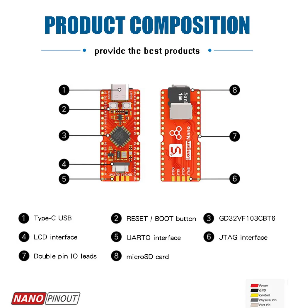 Longan Nano основан на GD32VF103CBT6 GigaDevice (RISC-V Архитектура) минималистическая разработка для дизайна чипов. Плата разработки ведет все IO чипа, дизайн небольшой Гениальный и изысканный, бортовой Type-C, LCD, sd-карта, JTAG и другие интерфейсы, удобный для студентов и инженеров Учителя и энтузиасты-гейки свяжутся с нами, чтобы узнать процессор RISC-V последнего поколения.
