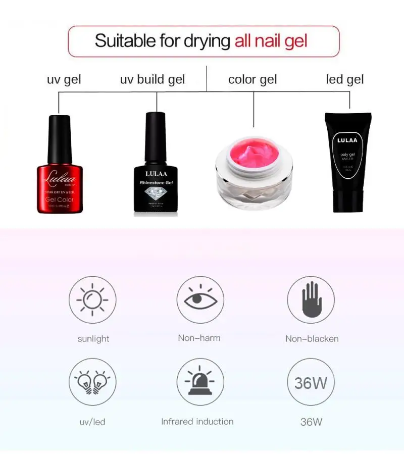 Этот продукт является профессиональной сушилкой для ногтей, обеспечивающей уровень ухода за салонами не только для ногтей, но и для ногтей на ногах. В отличие от традиционной УФ-лампы для ногтей, в дополнение к УФ-клею для ногтей, эта нагревательная машина также может использоваться для сушки любого другого геля для ногтей.