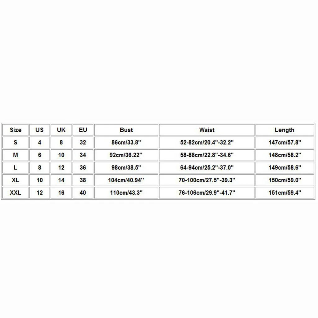 Размер США Великобритания ЕС Бюст Талия Длина S 4 8 32 86 см/33,8" 52-82 см/20,4 "-32,2" 147 см/57,8" М 6 10 34 92 см/36,22'' 58-88 см/22,8 "-34,6" 148 см/58,2" L 8 12 36 98 см/38,5" 64-94 см/25,2 "-37,0" 149 см/58,6" XL 10 14 38 104 см/40,94'' 70-100 см/27,5 "-39,3" 150 см/59,0" XXL 12 16 40 110 см/43,3" 76-106 см/29,9 "-41,7" 151 см/59,4"