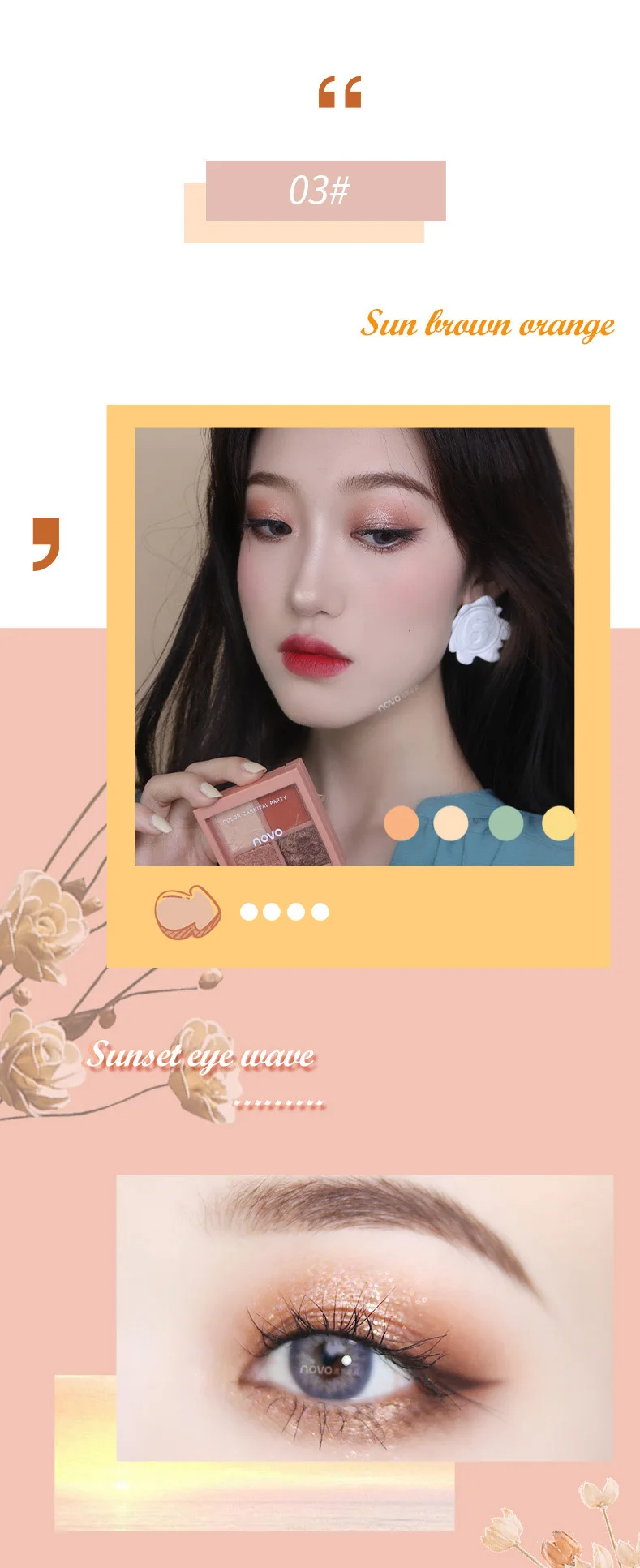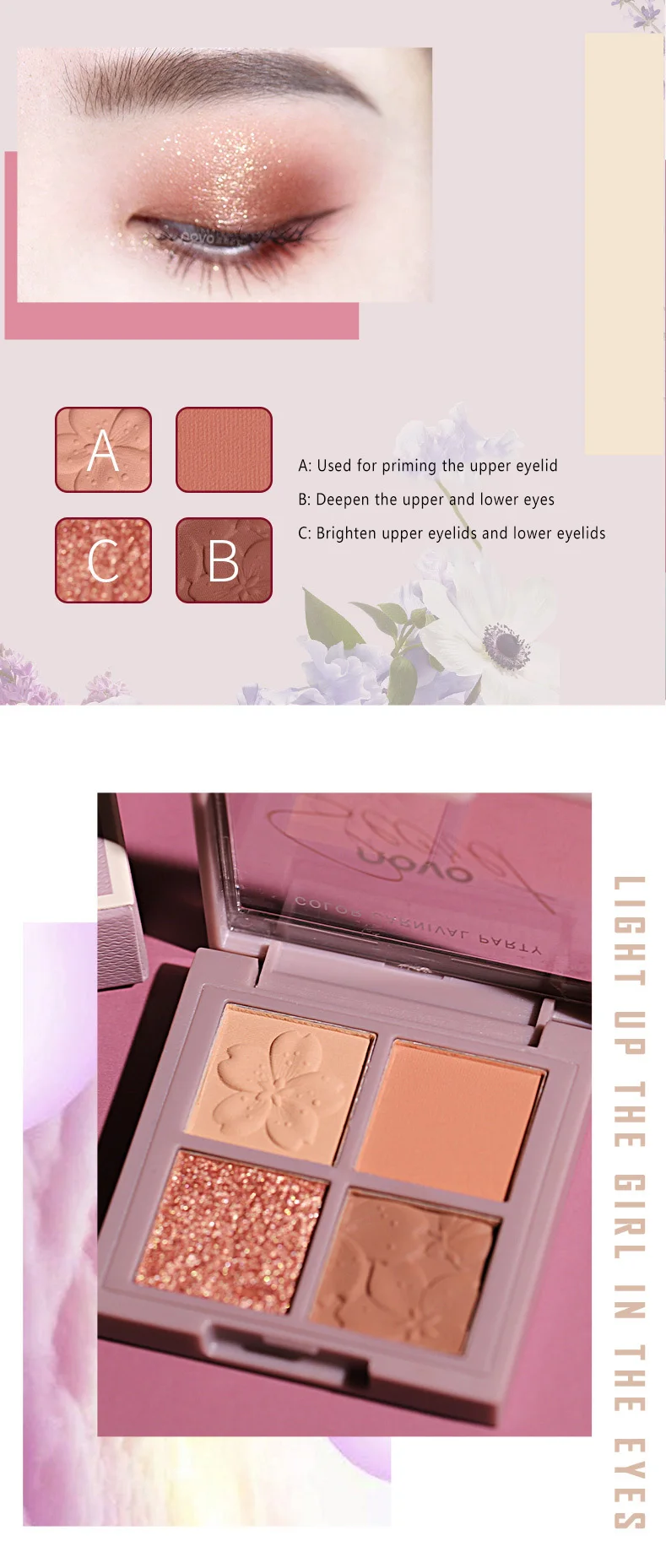 * Шелковистая мягкая и нежная текстура основы, хорошая пластичность, так что цвета могут быть наложены слоем, эффект длительный, естественный и очаровательный, без порошка, без цветения. Десятицветная палитра, подходит для вечеринок, студий макияжа, сценического макияжа, для удовлетворения различных потребностей разных макияжей.