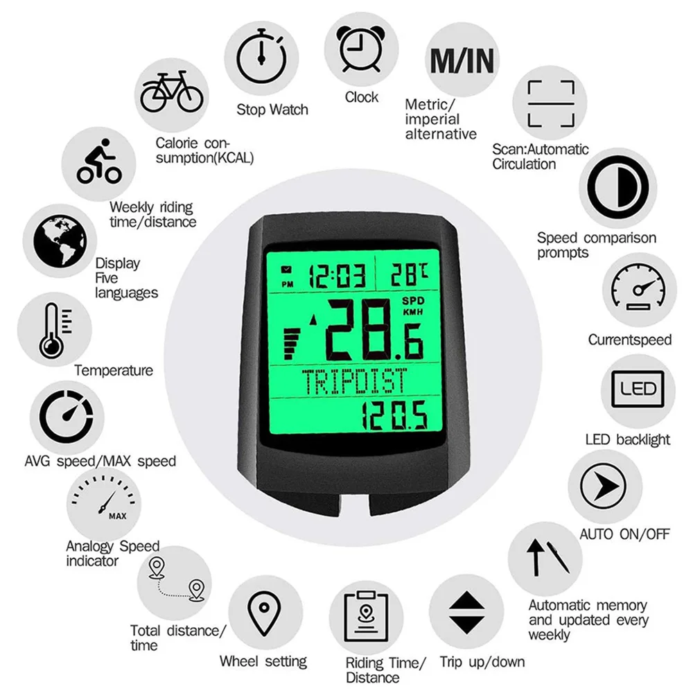 Этот беспроводной Велосипедный одометр сочетает в себе несколько функций в одном, отображая пять языков: английский/немецкий/французский/испанский/голландский. Кроме того, 20 функций для различных требований к катанию, таких как отображение часов/Секундомер/дисплей поездки/время поездки/Максимальная скорость/скорость avg/поездка вверх/калорийность и т. д.