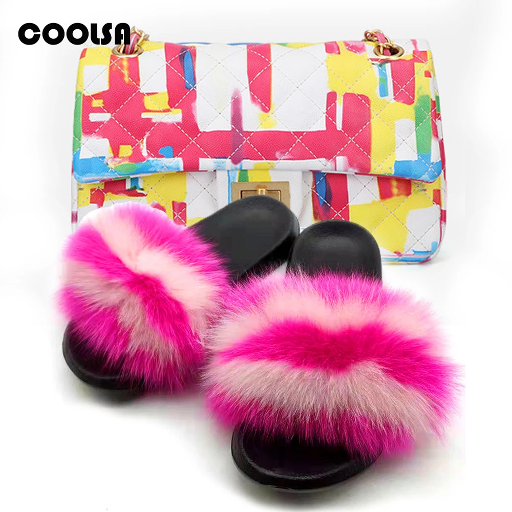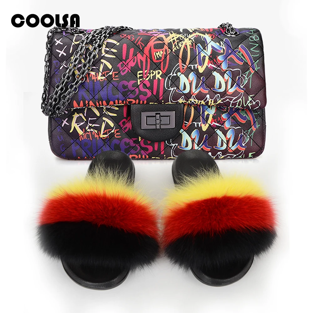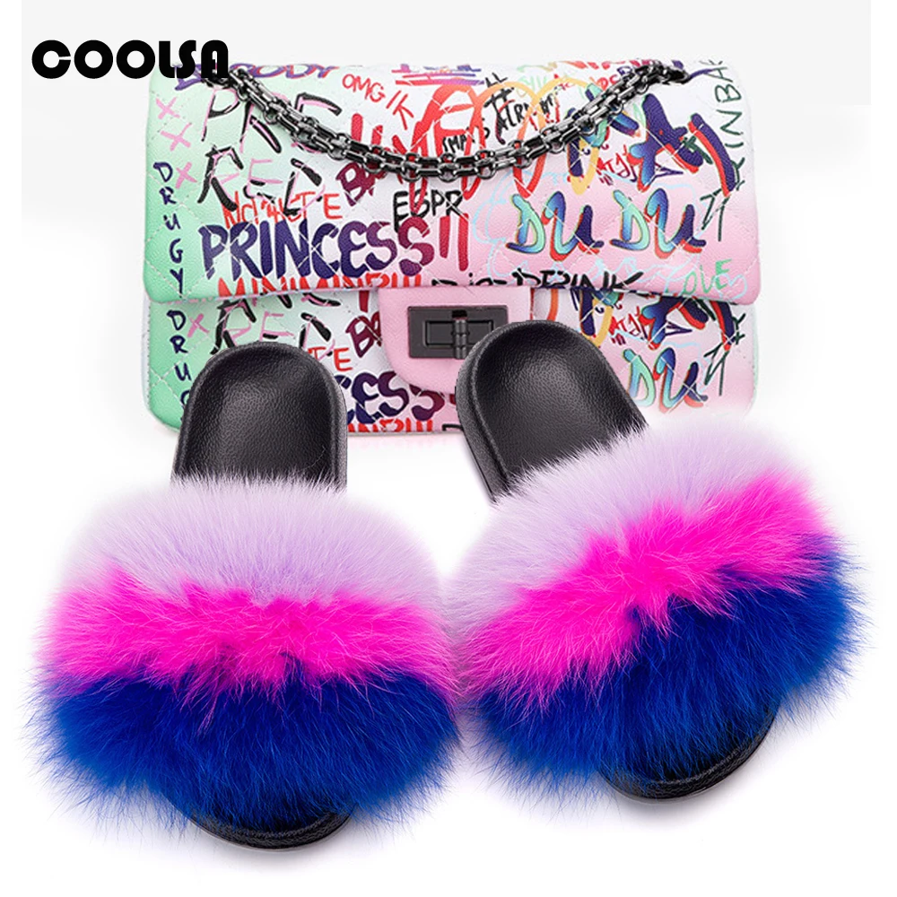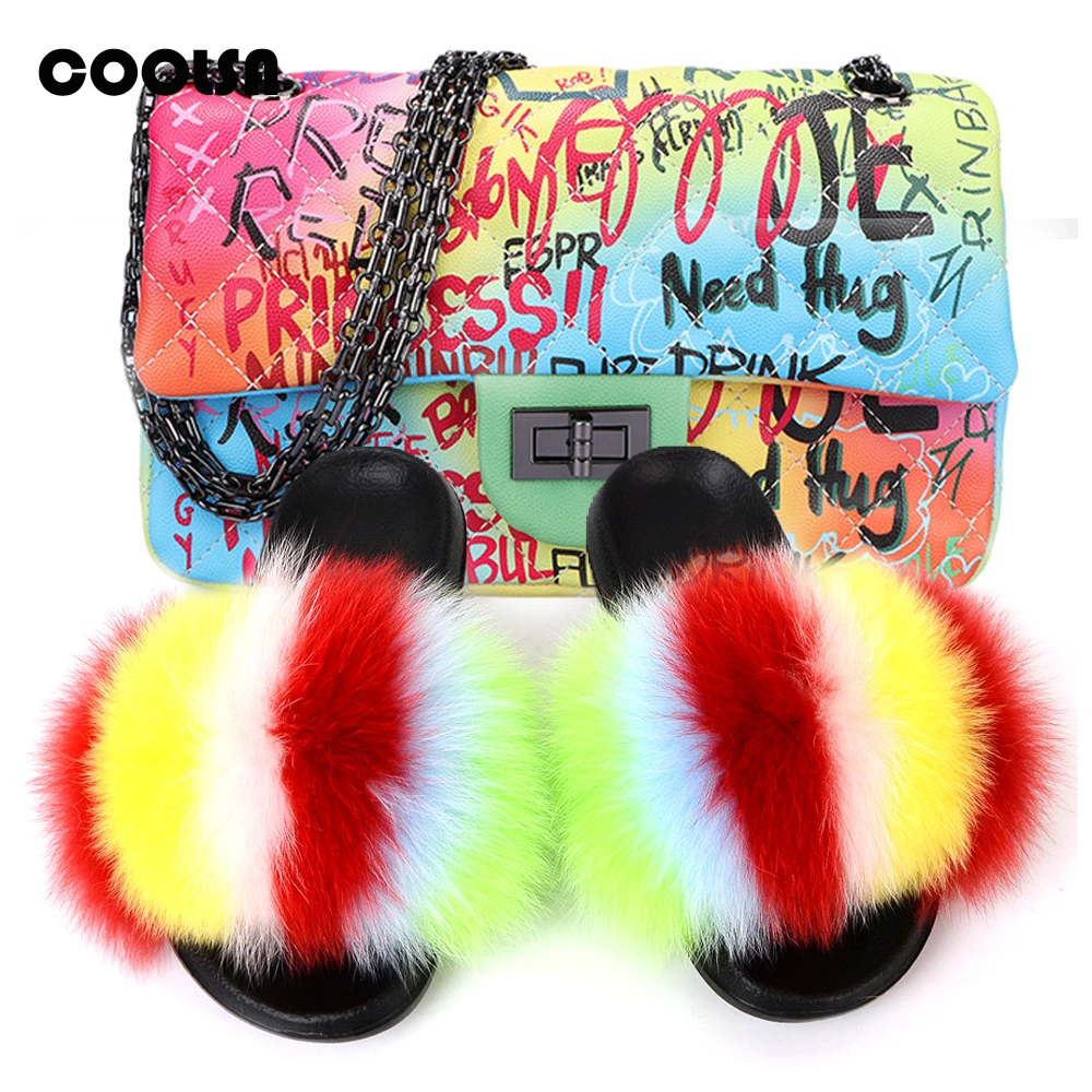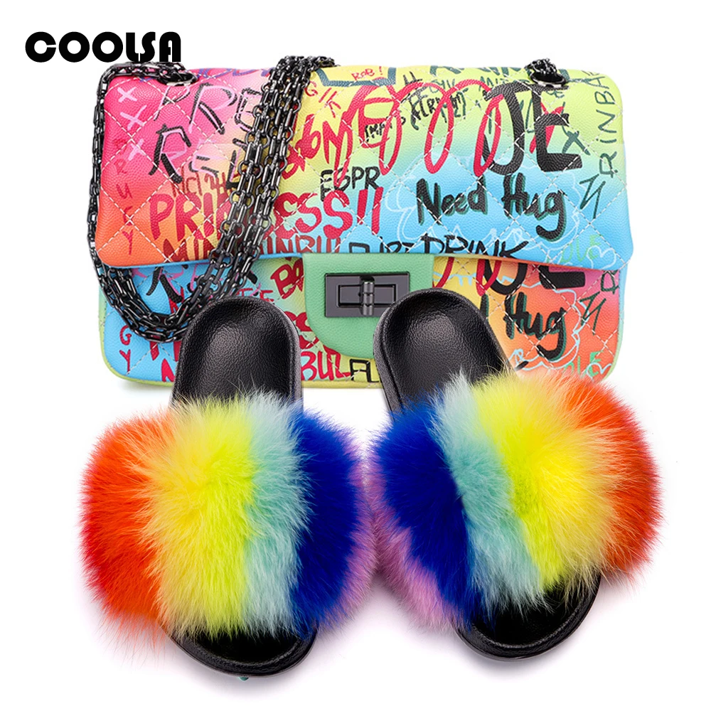 Женская Роскошная сумка через плечо: Радужный комплект с кошельком Женские тапочки с лисьим мехом: сандалии с натуральным мехом/мехом енота 2 шт./компл.: женские пушистые меховые шлепанцы и сумки той же расцветки Подходит для: на открытом воздухе Повседневный/Путешествия/Отдых Набор Милая женская обувь на меху; Милая разноцветная обувь