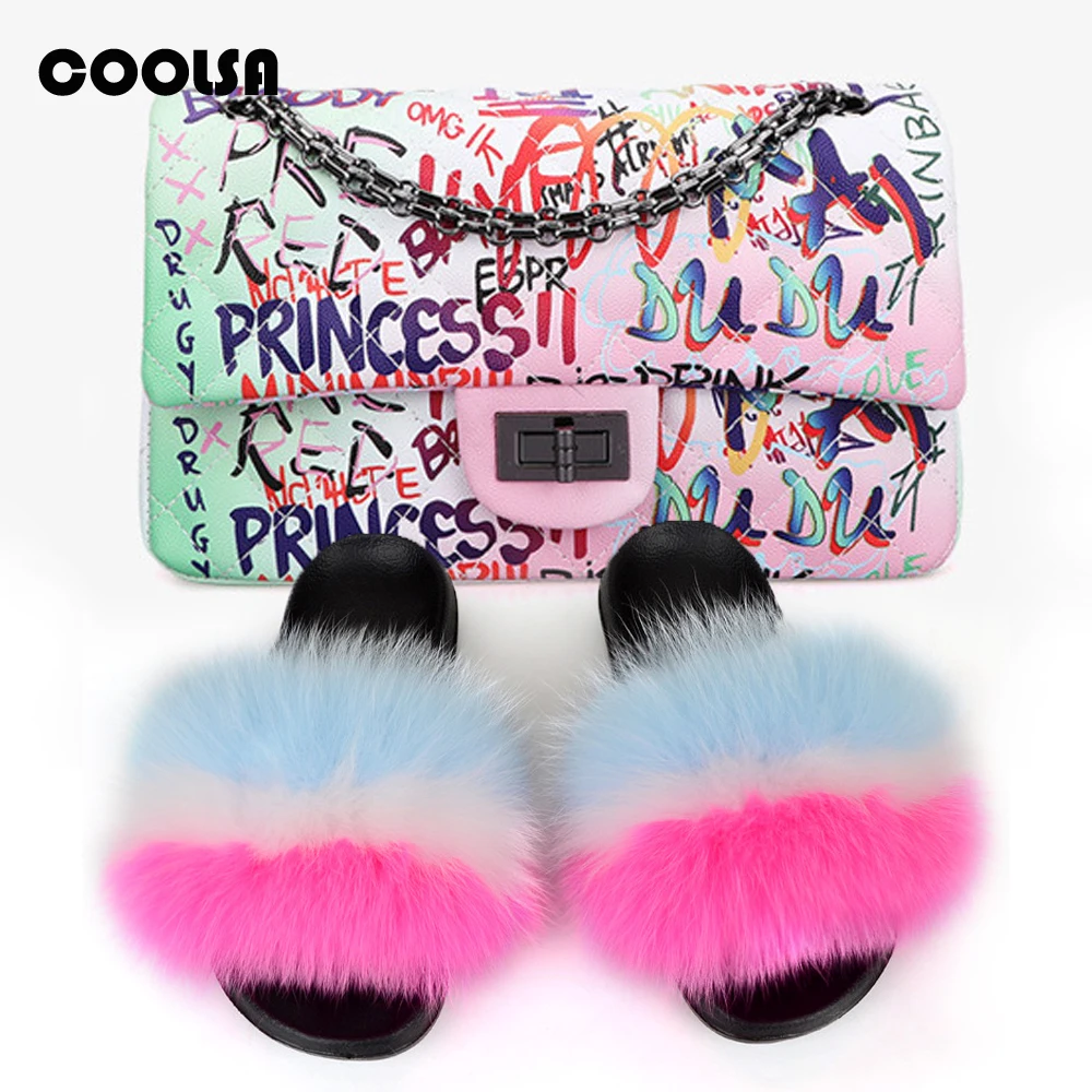 Женские меховые тапочки; Комплект с сумочкой; Пушистые шлепанцы с натуральным лисьим мехом; Женские Вьетнамки с мехом; Женская сумочка с граффити; Радужный комплект с кошельком