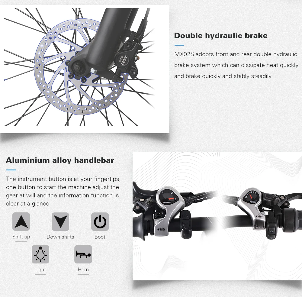 【Двойная гидравлическая опора MX02S Электрический велосипед принимает переднюю и заднюю двойную гидравлическую тормозную систему, которая может быстро и стабильно рассеивать тепло.