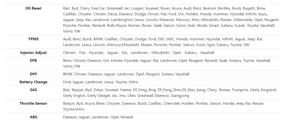 Обслуживание сброса: сброс масла, TPMS, ABS, SAS, TPS, DPF, EPB, испытание батареи, инжектор настроить все включено для удовлетворения ваших дополнительных потребностей.