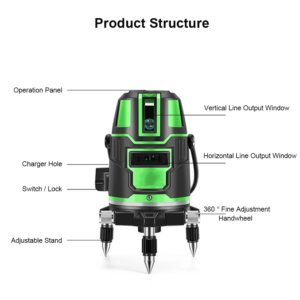 Амортизирующая самонивелирующаяся система: движение Лазерного Уровня заставит лазерные линии вибрировать. Система компенсации демпфирования может сократить время вибрации, выровнять лазерные линии как можно быстрее, решить проблему тряски линий. Более гибкий, значительно повышает эффективность работы!