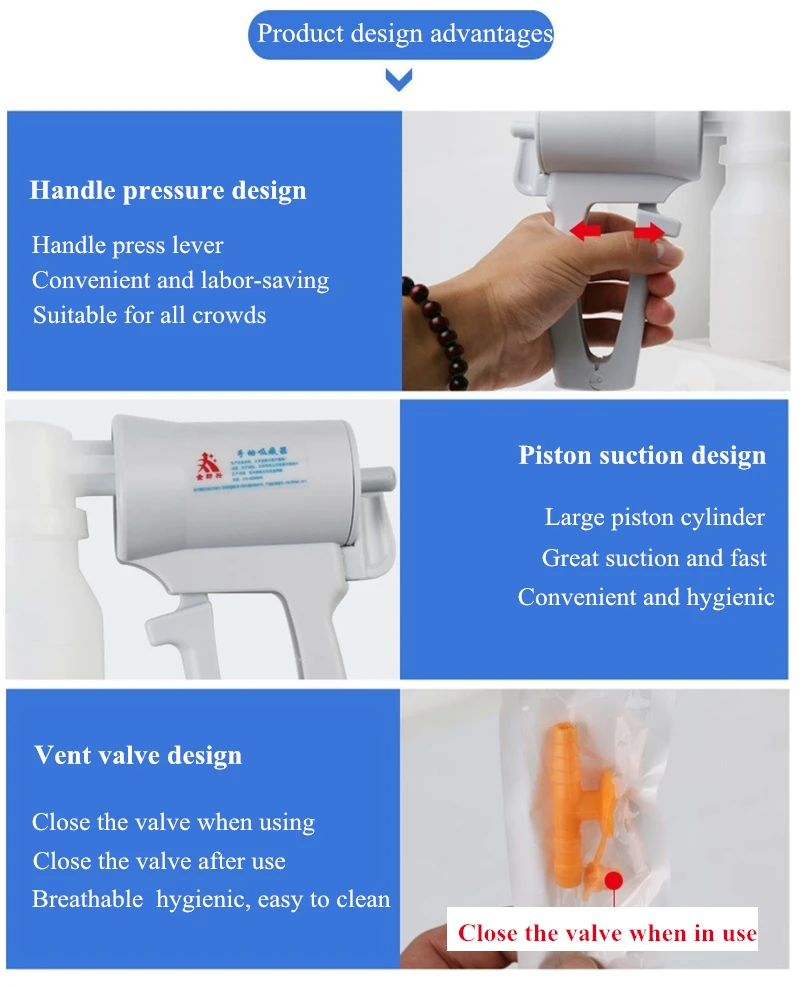 Ручной аспиратор от мокроты SL-XT-02 ручной аспиратор от мокроты-это устройство для Всасывания мокроты, слюны, всасывания крови и т. д. Этот продукт состоит из трех частей: бутылки для хранения, вакуумного насоса и всасывающей трубки. Принять отрицательное давление системы, простота в эксплуатации, не потребление энергии, нет ограничений по условиям окружающей среды, маленький размер, светильник вес, умною структуру. Подходит для домашнего ухода. Он также может быть оборудован в аптечке первой помощи. 1. Аспиратор от мокроты ручного отрицательного давления легко переносится вакуумный генератор, ему нужна только одна рука для выполнения первой помощи. 2. Концепция дизайна нашего отрицательного давления sputm аспиратора обеспечивает простую работу, регулируемую ручку всасывания, может обеспечить различное точечное давление всасывания 3. Максимальное отрицательное давление ≥ 0025 МПа, соединение трубки мокроты с вакуумным насосом мощность более 4Н и емкость бутылки для хранения жидкости составляет 100 мл