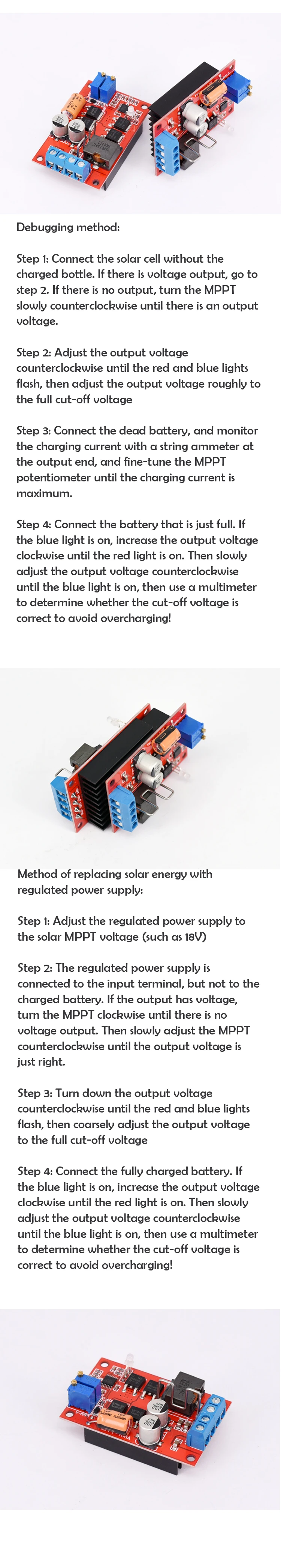 1. Максимальная точка контроля мощности солнечной батареи, выходной ток выше, чем ток солнечной панели, действительно сверхвысокая эффективность MPPT, поддержка 8-28 в, высокая зарядка солнечной батареи в течение 100 Вт, рекомендуется, чтобы каждая солнечная панель была оснащена этим модулем) несколько модулей могут быть подключены одновременно, чтобы расширить ток зарядки 2. Выходное напряжение может быть отрегулировано произвольно, CC-CW автоматического управления (может поддерживать с одной ячейкой или мульти-сотового литиевые батареи или литий-железо-фосфатных аккумуляторов и никель или свинцово-кислотных аккумуляторных батарей, высокомощный светодиодный и т. д.) 3. Управление полной зарядкой аккумулятора 4. Частота переключения ШИМ: 300 кГц 5. Постоянный ток, зарядный ток устанавливается внешним сопротивлением (по умолчанию 5000mA / 2000MA) 6. Непрерывная зарядка, глубоко разряженный аккумулятор 7. Двойной индикации состояния зарядки до момента окончания состояние зарядки (красный светильник на при зарядке/полный синий светильник на красные светильник мигающий и синий светильник always on, поэтому нет необходимости батареи подключен) 8. Функция мягкого запуска при низком уровне мощности 9. Используется импортный высокочастотный низкий уровень проводимости, двойной МОП-трубок, 10 А, двойные диоды с высоким током, высокоэффективный плоский мощный индуктор, резисторы постоянного тока, ультра-Малое падение напряжения защита от обратной защиты, защита от обратного подключения не работает, и защита от обратного подключения выводится к повреждению зарядного устройства.
