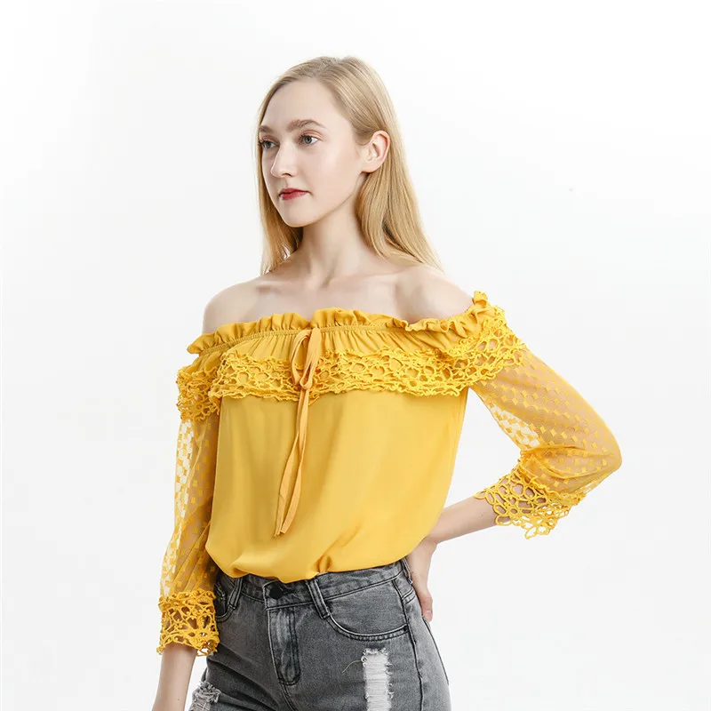 Модная элегантная женская рубашка, вязанные крючком тонкие топы, кружевная Лоскутная Вышивка, рукав девять, Офисная желтая блузкаТаблица размеров