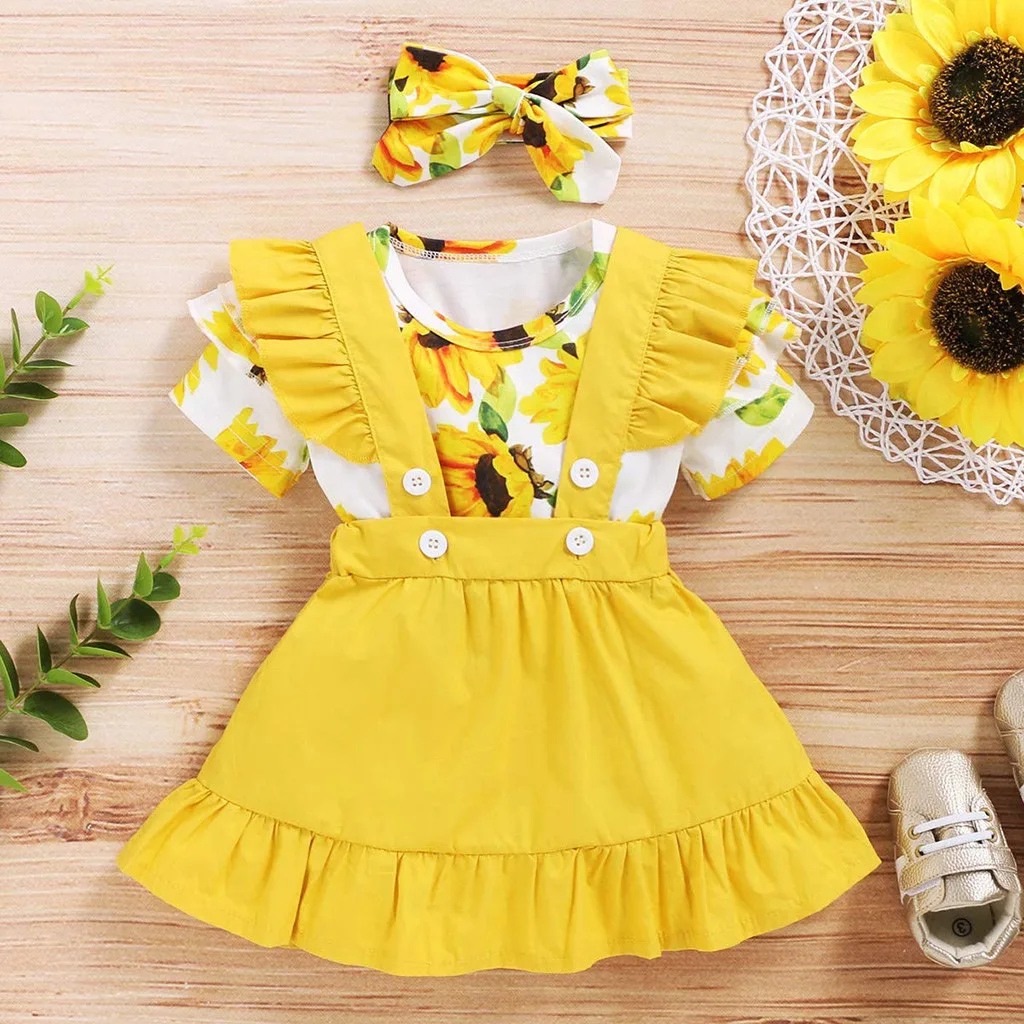 Комбинезон с оборками и принтом подсолнуха для маленьких девочек; Боди + юбка на подтяжках; Комплекты одежды