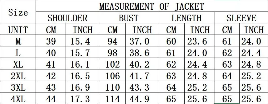 РазмерИзмерение курткиПлечоБюстДлинаРукавБлокСмДюймСмДюймСмДюймСмДюймМ3915,49437,06023,66124,0L4015,79838,66124,06224,4XL4116,110240,26224,46324,82XL4216,510641,76324,86425,23XL4316,911043,36425,26525,64XL4417,311444,96525,66525,6