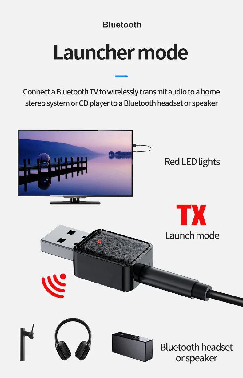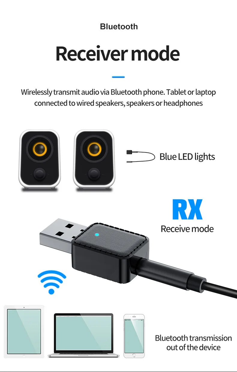 B. Режим передатчика: красный светодиодный индикатор мигает, показывая, что он был переключен на режим передатчика. USB продукта используется для источника питания и может быть подключен к любому USB интерфейсу с выходом 5 В. В режиме запуска продукт будет автоматически искать другие устройства приема Bluetooth, которые были включены (например, Bluetooth гарнитуры, Bluetooth колонки, Bluetooth приемники и т. Д.). Красный светильник всегда включен. Применение 3,5 мм аудио-кабель для подключения к звуковой выход устройств, таких как телевизоры и компьютеры. В это время звуковой выход устройства беспроводным образом передается на bluetooth-динамик, bluetooth-гарнитуру и другие принимающие устройства через этот продукт.