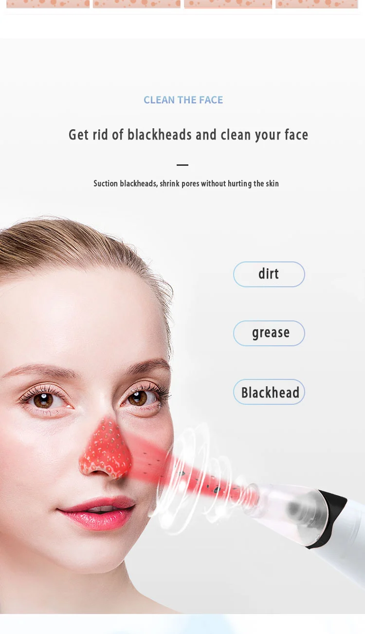 Сосание черных точек, сужение пор, не повреждая кожу. 3 вида всасывающих головок, 1 машина Многоцелевой: 1. Маленький круглый наконечник: небольшое всасывание, подходит для тонкой кожи и чувствительных мышц; 2. Средний круглый наконечник: для людей с чрезмерной жирностью акне; 3. Большая круглая присоска: она имеет большую мощность всасывания и может легко высасывать черную головку в области Т лица. Различные всасывающие наконечники могут ухаживать за чувствительной кожей и отвечать вашим различным требованиям. Три режима регулировки, глубокое очищение, подходит для всех типов кожи. Низкосортное всасывание: подходит для жирной кожи и деликатных частей; Всасывание среднего диапазона: подходит для нормальной кожи, удаляет черные точки; Высококлассное всасывание: подходит для сухой кожи, удаляет стойкие пятна.