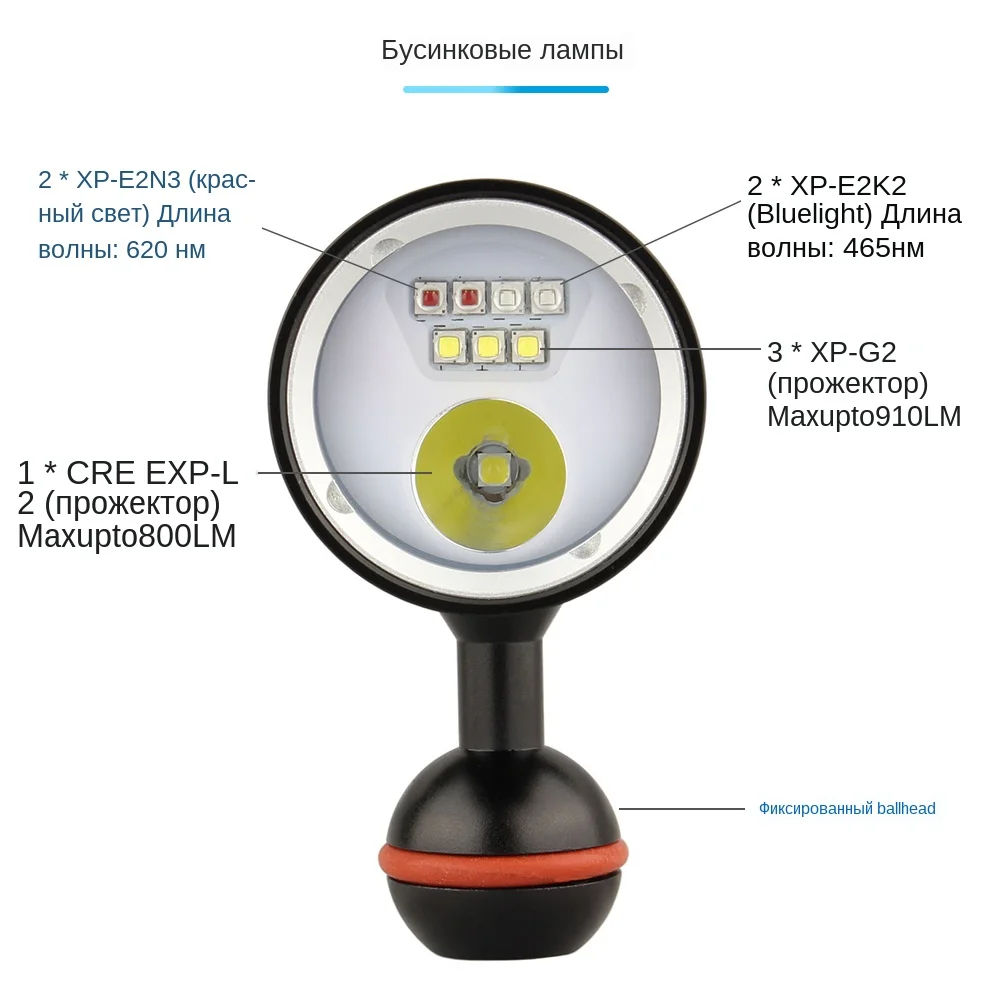 ① CREE XP-G2 * 3 / CREE XP-L2 * 1 / CREE XP-E красный * 2 / CREE XPE синий * 2 ②Прочная головка лампы из алюминиевого сплава, улучшает теплоотдачу, износостойкое окислительное покрытие ③ Система автоматического сброса яркости. Белый (прожектор)-белый-красный-синий; Интеллектуальный дисплей питания: Зеленый 80%-красный 30%-красный flash10 % ниже ④Отверстие для шнуровки; Конструкция с завальцовкой; Подставка для головы. ⑤Специальная подводная фотография заполняющий светильник; Избегайте беспокойства красный светильник. Eyelпетелька.
