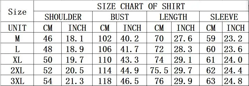 РазмерТаблица размеров рубашкиПлечоБюстДлинаРукавБлокСмДюймСмДюймСмДюймCМДюймМ4618,110240,27027,65923,2L4818,910641,77228,36023,6XL5019,711043,37429,16124,02XL5220,511444,975,529,76224,43XL5421,311846,57629,96324,8