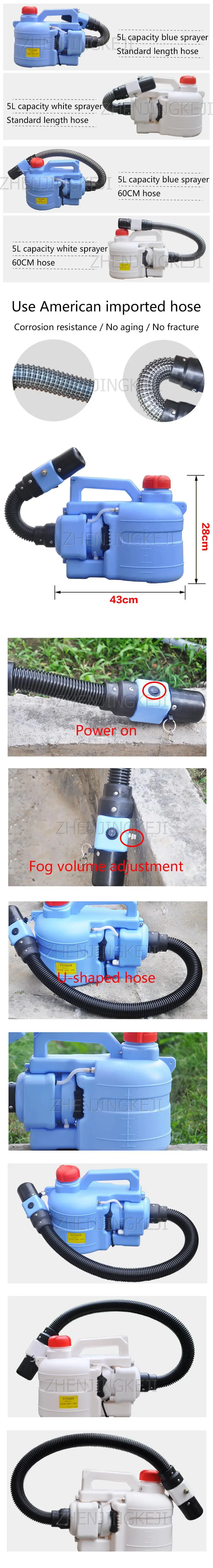 Model: PWQ-01 Voltage: 110 / 220V Power: 800W Net weight: 2.8KG Package weight: 4KG Packing size: 49 * 23 * 31CM Spray volume: electric ultra-low volume sprayer Fog particle size: 0 ~ 20 microns Static wind range: 6 ~ 8m Medicine box capacity: 5L Outlet pipe length: 8cm (length can be specified)