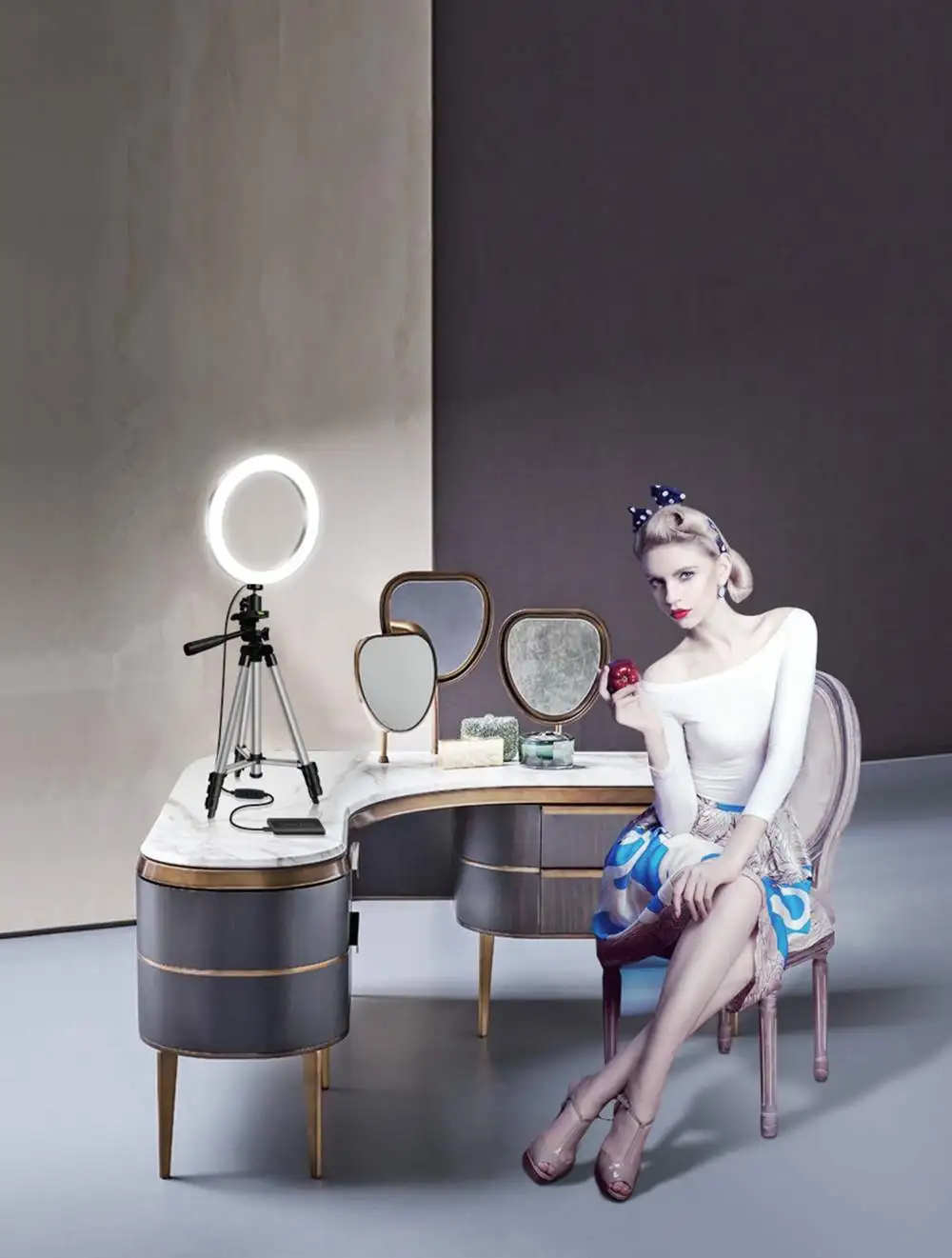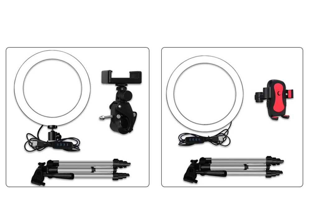Черный комплект включает в себя: светильник, кольцо, штатив, селфи-палку, зажим для телефона (без пульта дистанционного управления)