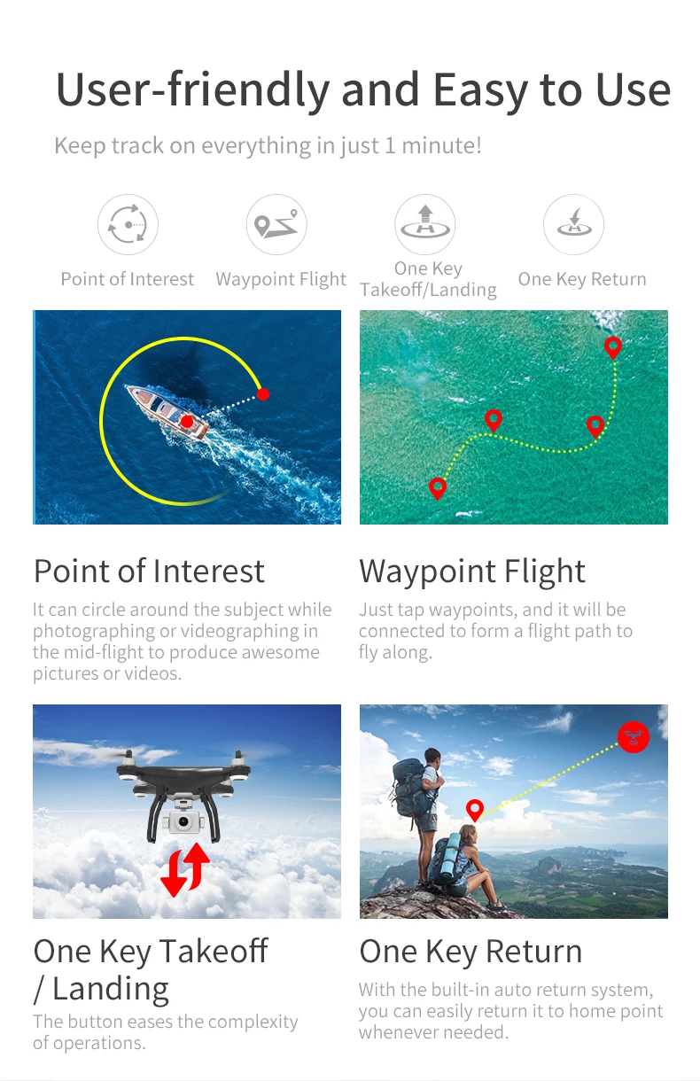 4K (1080P интерполяция 4k) 300 метров 5G передача изображения/120 ° Широкий угол/Разрешение фото 4K(3840*2160) разрешение видео 2048x115 2P/20 кадров/угол дистанционного регулирования 90 °. Функция приложения: отслеживание GPS/Отслеживание изображения/траектория полета/Объемное изображение с фиксированной точкой/распознавание жестов/увеличение изображения/фильтр 1. Бесщеточный двигатель: бесщеточный двигатель, низкий уровень шума, плавная работа, более длительный срок службы двигателя 2. Функция объемного окружения с фиксированной точкой, может быть установлена в соответствии с вашим приложением вокруг точек, чтобы сделать полет более интересным. 3. GPS размещает самолет самостоятельно, и он более надежен для дальних полетов. 4. Функция следования: камера дрона будет нацелена на пользователя и будет держать определенное расстояние для отслеживания, помогая вам записывать каждый момент момента. Аккумулятор большой емкости 5,2200 мАч, время работы до 19 минут, позволит вам веселиться 6. Направление и вертикальный угол камеры, контролируемые пультом дистанционного управления, могут быть 90 градусов, и изображения, которые вы хотите, могут быть легко сняты. Камера может управлять углом от 0 до-90 градусов и широкоугольной камерой 120 градусов. 7. Распознавание жестов: Используйте жесты Победы для управления фотографированием; Режим для управления видеозаписью, что проще и проще. 8. Карданный шарнир: самостабилизирующий стабилизатор против тряски, делает фотографии и видео лучше и проще.