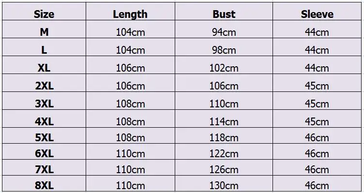 M: Длина: 104 см бюст: 94 см Рукав: 44 см L: Длина: 104 см бюст: 98 см Рукав: 44 см Размер XL: Длина: 106 см Обхват груди: 102 см, длина рукава: 44 см 2XL: Длина: 106 см Обхват груди: 106 см, длина рукава: 45 см 3XL: Длина: 108 см Обхват груди: 110 см, длина рукава: 45 см 4XL: Длина: 108 см Обхват груди: 114 см, длина рукава: 45 см 5XL: Длина: 108 см Обхват груди: 118 см, длина рукава: 46 см 6XL: Длина: 110 см Обхват груди: 122 см, длина рукава: 46 см 7XL: Длина: 110 см Обхват груди: 126 см, длина рукава: 46 см 8XL: Длина: 110 см Обхват груди: 130 см, длина рукава: 46 см