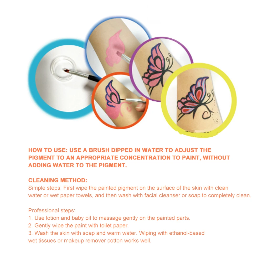 1. Подходит как для лица, так и для тела, водорастворимый пигмент, легко моется.