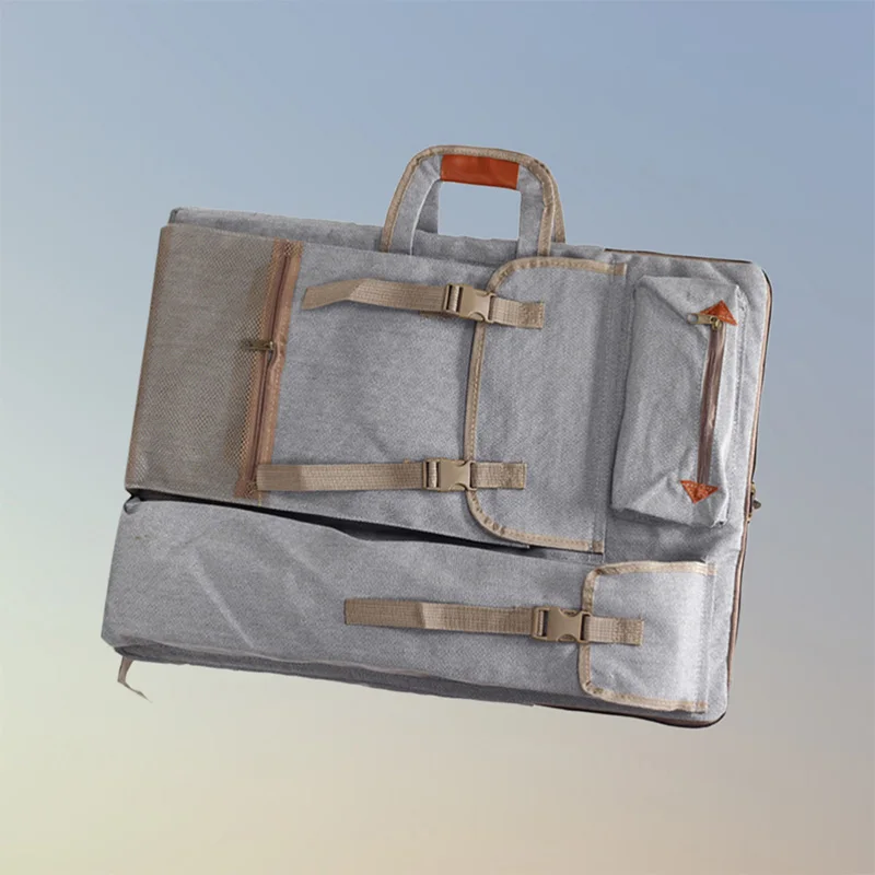 This is an art portfolio bag, made of soft but durable canvas, wearable and mildewproof for long-term use. It is equipped with shoulder straps and handles, portable as the shoulder bag as well as the tote bag. The side bags are good for storage of pencils, drawing pens, painting brushes, palettes, and other art supplies. This drawing board bag is suitable for artists, painters, teachers, students, etc.